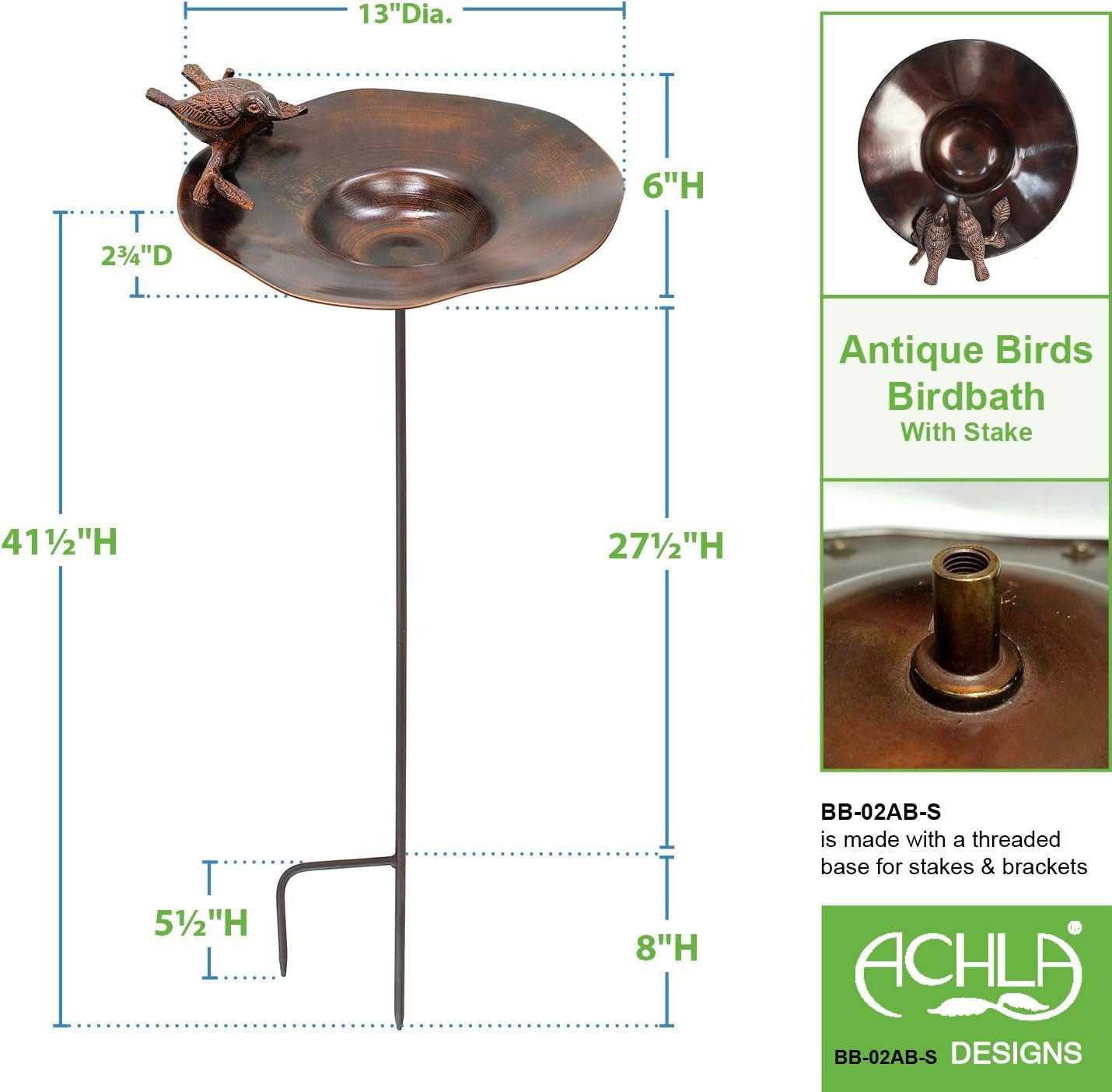 This beautiful brass birdbath has a soft bowl with two cheerful songbirds perched on the wide undulating rim. This bowl is available alone or with a Threaded Stake (BB-14). It can also be used with any of our mounting brackets for poles posts or handrails.