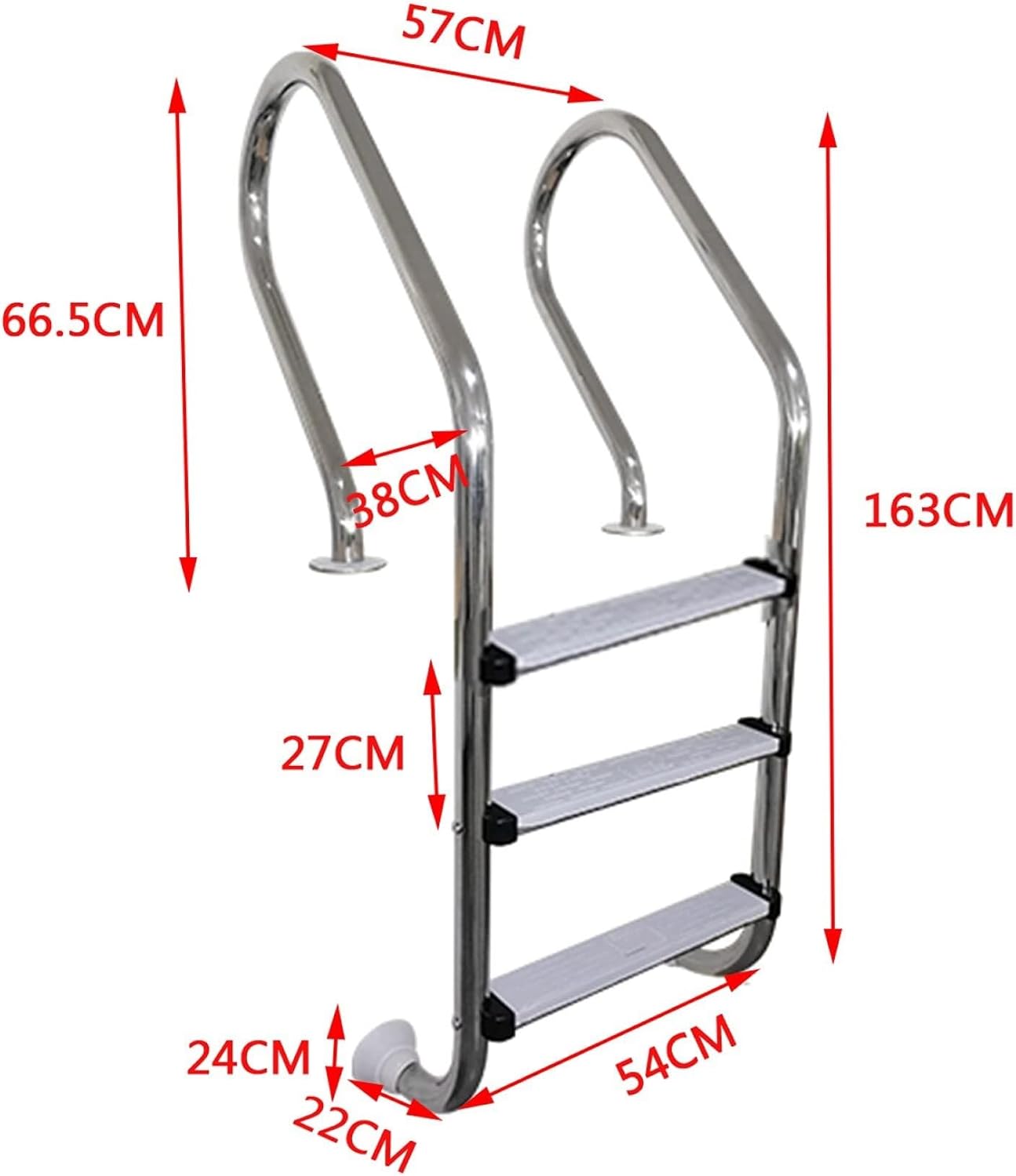 Product Description:The Stainless Steel 3-Step Swimming Pool Ladder is designed to provide safety, comfort, and durability for your pool. Constructed from high-grade stainless steel, this ladder features a corrosion-resistant finish and a smooth polished surface that is easy to maintain. The ergonomic curved handrail fits the natural shape of your hand, ensuring a comfortable and secure grip as you enter and exit the pool. The ladder’s three anti-slip steps provide stability and safety, making it an ideal choice for swimming pools, hot springs, ramp entrances, and water parks. It is especially suitable for children, the elderly, and individuals with mobility challenges. This ladder is designed for easy installation and can be used in pools with a water depth of 100-140cm. Enhance the safety and style of your pool with this practical and elegant ladder.