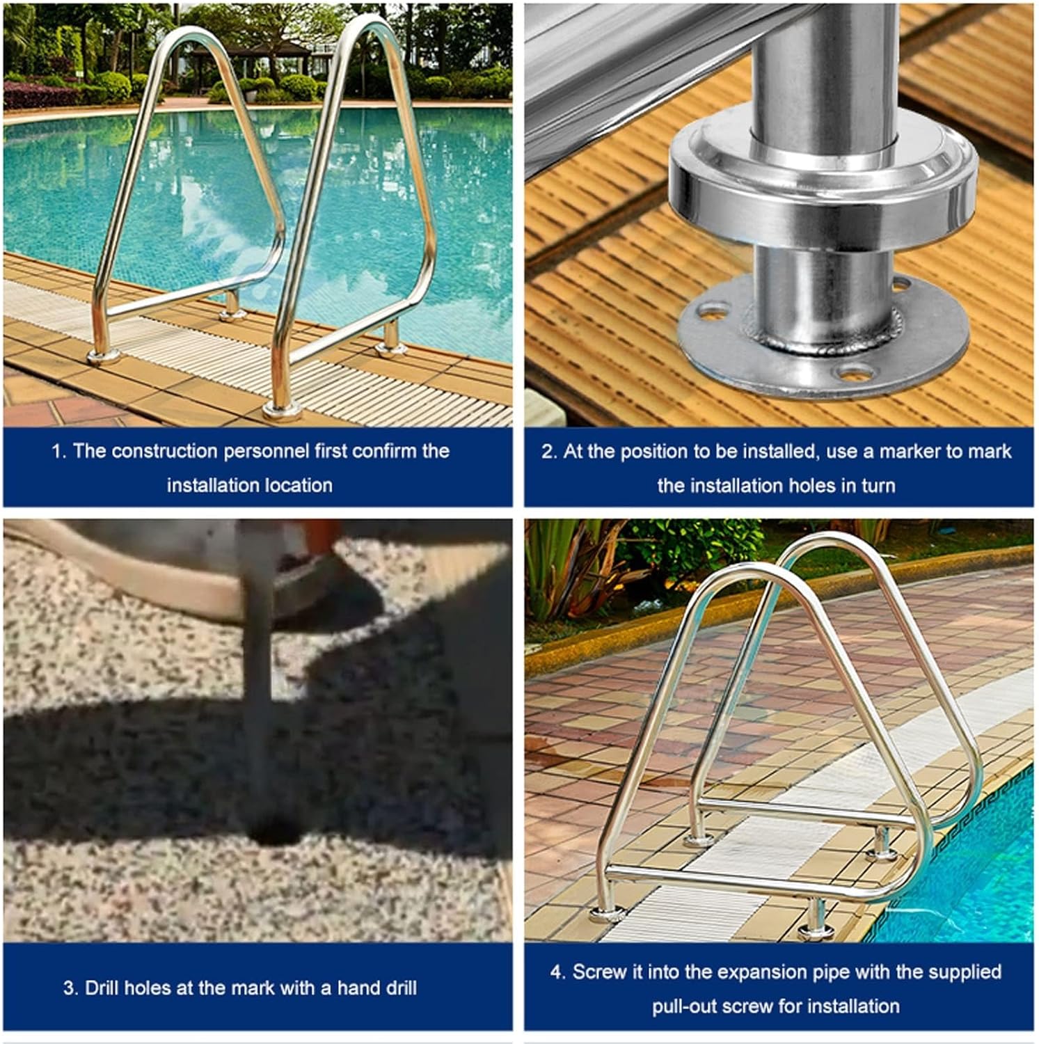 Welcome to our shop The hot summer has arrived, and our pool handrails will help you enjoy water entertainment in the pool. 304 stainless steel ensures your pool stair railings will be rust-free for years to come. Swimming pool handrails are suitable for any size pool, with small footprint, high load capacity and excellent grip, which can help your family or friends get in and out of the pool easily, stability ensures safe and solid support for water entry and exit, and can carry up to 350 lbs. Product name: swimming pool handrail/pool railing/pool handrail. Color: silver Material: 304 stainless steel Surface: smooth, polished Weight: 4.5kg Tube thickness: 1.0mm,1.2mm,1.5mm Packing list: 1x swimming pool handrail 4 x matching screws Dimensions: 90 x 56 x 81 cm (35.4in x 22 in x 31.9 in) Notice: Since product size is measured manually, there may be an error of 0 ~ 2 cm. Due to different shooting angles and light, the display effect is different, so the color may be slightly different. How to clean Product Maintenance: --If the stainless steel handrails are stained with dust, just wipe them with a dry cloth. Precautions Pool grab ladders are easy to install and we recommend using an impact drill to drill holes into the concrete. If you are not satisfied after receiving the package, we provide you with a satisfactory solution! If you have any questions about our products, please feel free to contact us!