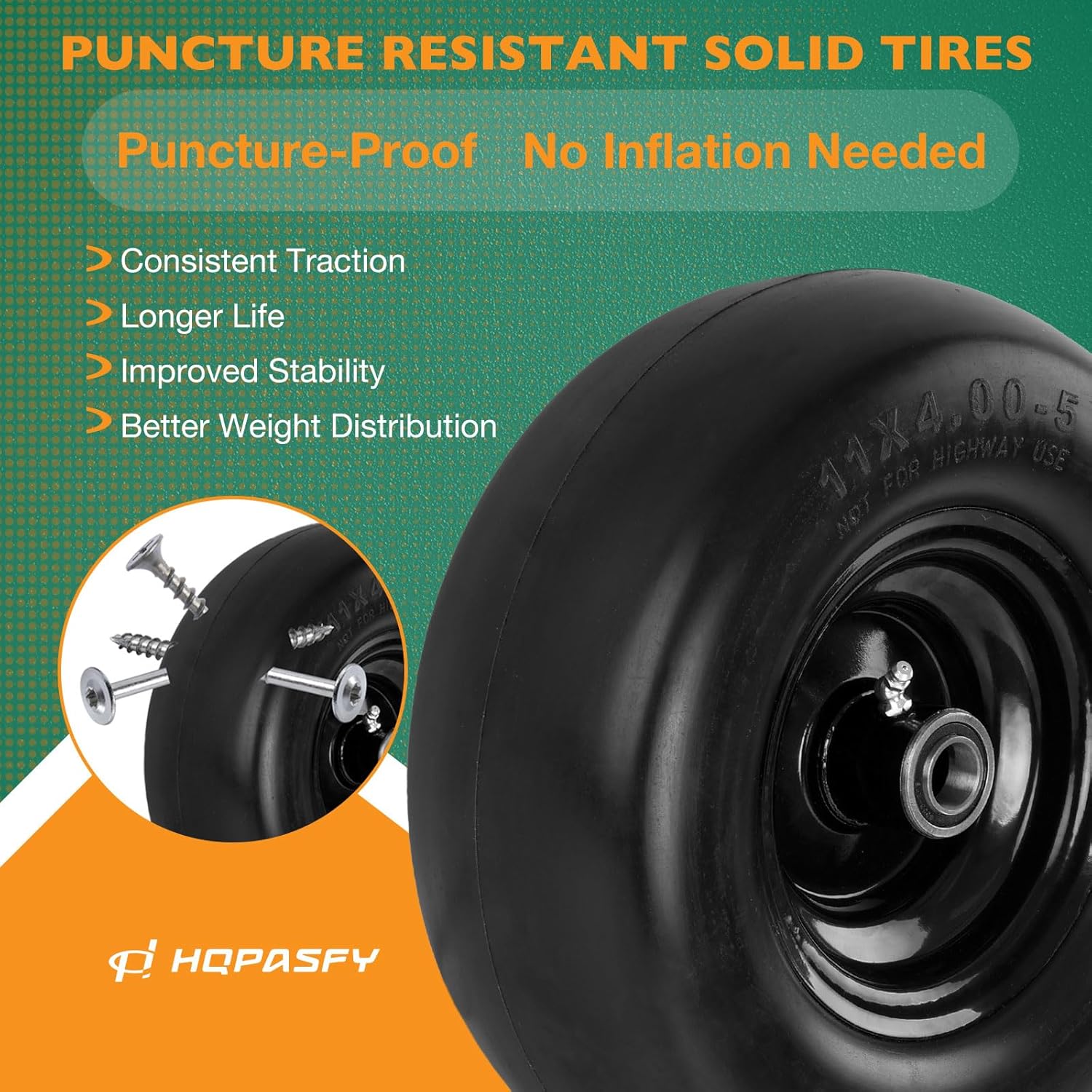 Upgrade your lawn equipment with HQPASFY’s Flat-Free Lawn Mower Tires and Wheels – built for durability, stability, and convenience.Products Include:2 Pack 11x4.00-5 flat free tires4 PCS 5/8" bearings4 PCS 1/4" long spacers4 PCS spacersThis flat-free tire and wheel set offers the perfect balance of durability, functionality, and convenience. Whether you’re mowing your backyard or working on a commercial landscaping project, these tires ensure smooth, uninterrupted operation.