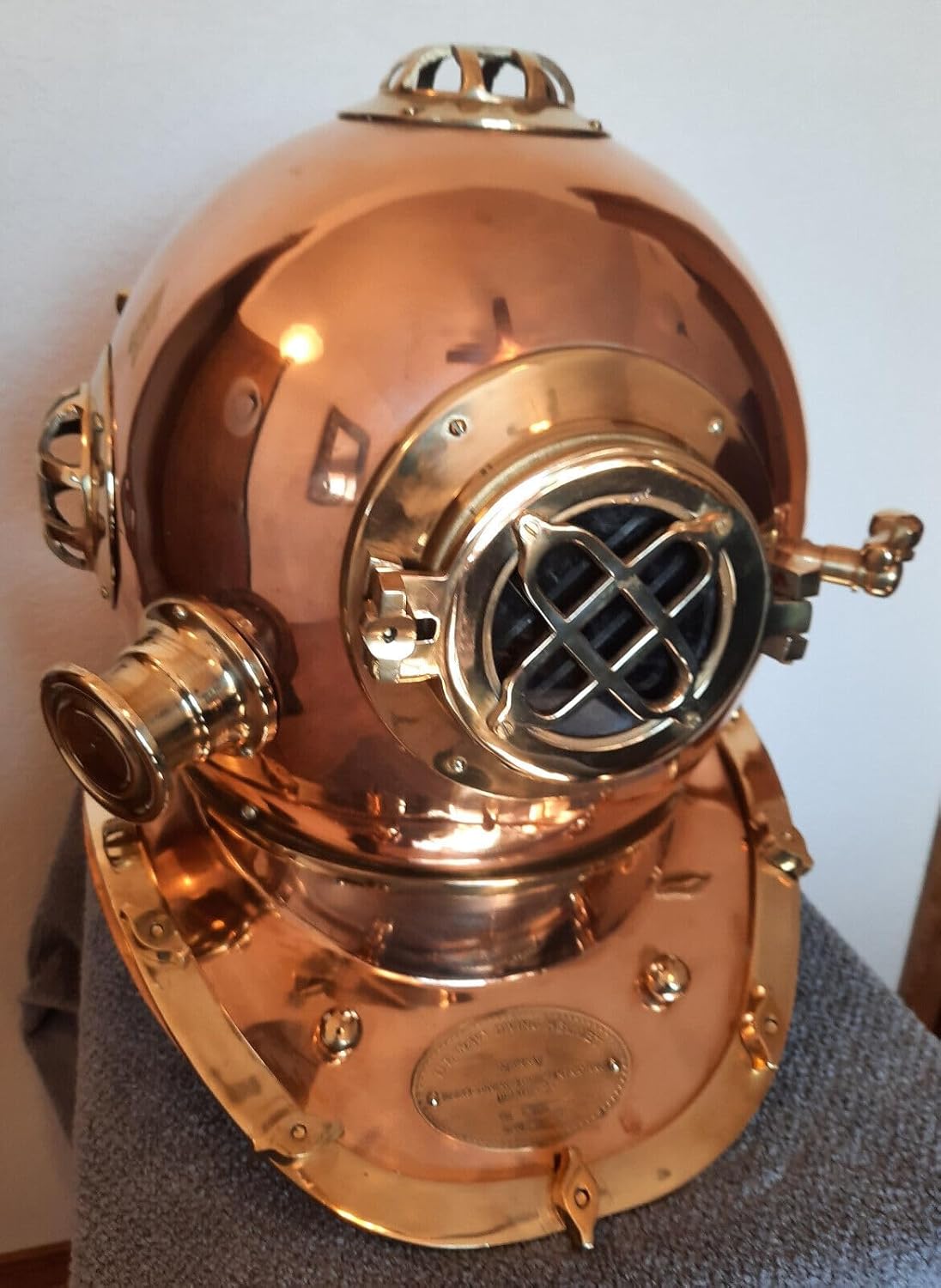 Description : Premium quality well made deep sea divers helmet replica. Metal : Iron & Aluminum Finish: As shown in Picture Approx. Size: 18 " Usage : Home Decorative, Desktop Decorative .Table Decorative Collectible Items Packing : Packing In Single Parcels. Corrugated Export Packing Used Manually Dyeing Antique Process Color May Be Differ A Little Bit Due To Manually