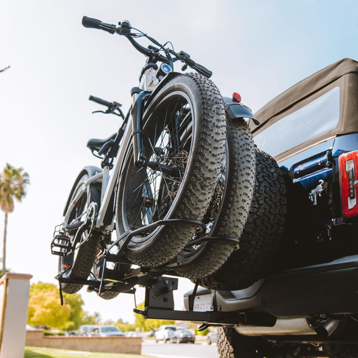 The updated 2019 Sport Rider SE2 is a heavy duty 2 bike hitch rack that will fit almost any style of bike using a new universal locking frame hooks and adjustable wheel holders. Simply drop the bike into the wheel holders, then slide the ratcheting locking hook down onto the frame to secure the bike. Features patented "No Wobble-no tools" hitch tightening system, a locking hitch pin, which is keyed alike to the frame hooks and a security cable. Folds flat against the car when not in use and tilts down for easy cargo door access. For 2" hitches only.