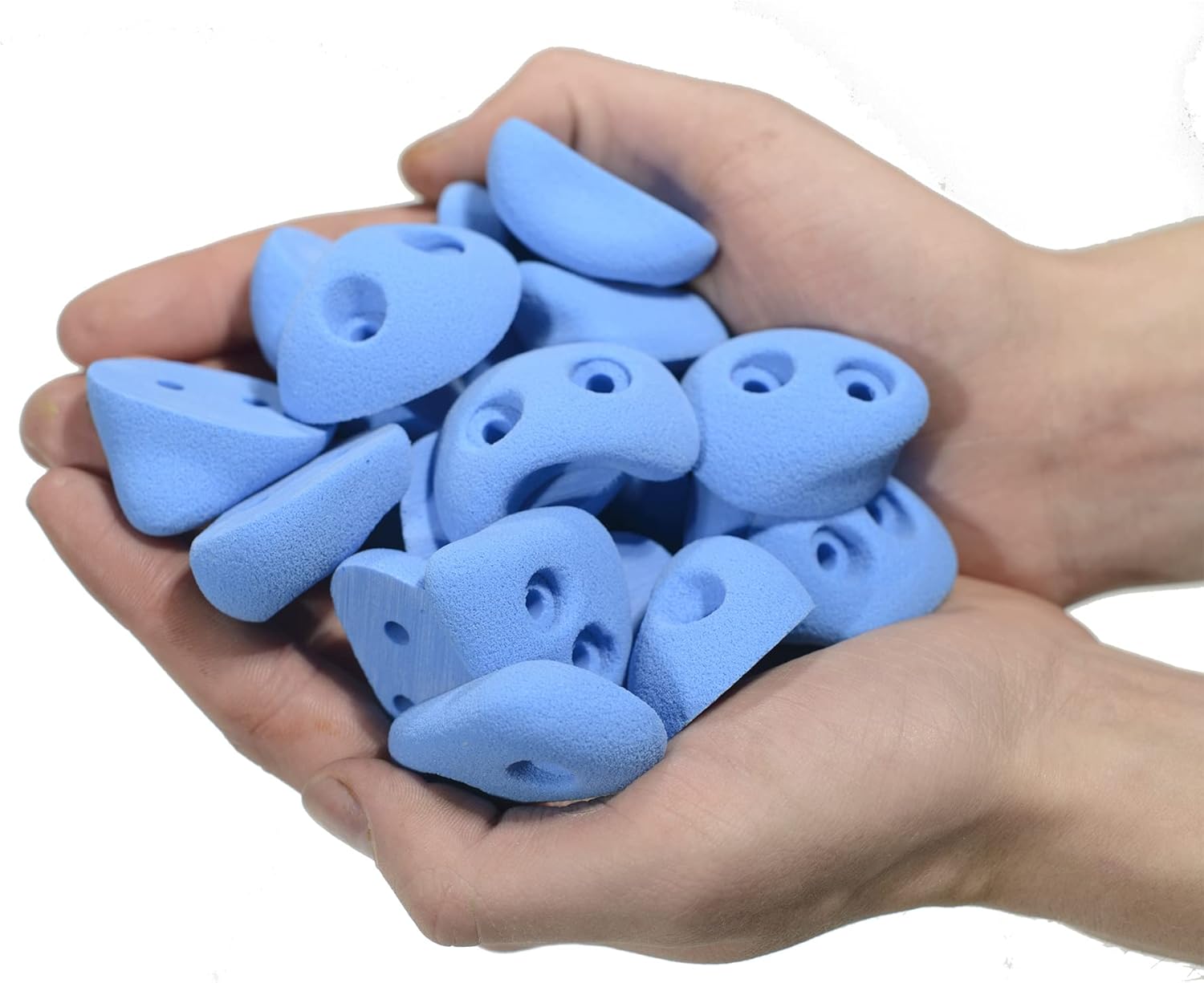 The 20 Screw-On Classic Footholds Set 2 includes: 20 Rock Climbing Holds40 indoor/outdoor structural wood screws Description: The 20 Screw-On Classic Footholds Set 2 is smaller than Set #1. Set #2 will be the set to get for your steep wall if you are trying to break into the V5+ range of climbing. Set #2 has the most variety out of the three sets. There are about ten holds that are rounded incuts, five that have a similar style but deeper incuts, and four pointy holds that require precision. If you are on the fence about which set to get, Set #2 gives the most mileage. Set #1 consists of footholds we wish boulder problems outside have but rarely do. This type of foothold is what intermediate to expert-level climbers want for their home wall. They require precision footwork while wearing a commercial climbing shoe. These sets are not for the tennis-shoe-wearing beginner. V2 on vertical walls. V3 on 25-degree walls. V4 on 45-degree walls. 45-degree to 60-degree incuts, which offers a positive foothold in steep terrain. Color: Blue. Colors may vary slightly from images. Texture: The texture is silky, grippy, and skin-friendly that feels like natural rock. Origin: Made in the USA with a premium and commercial grade non-toxic polyurethane resin. All of our products come with our 30-day return policy money-back guarantee. Size: Measures 1" to 2" wide x 1-1/4" tall x 3/4" to 1" standing off the wall. AMAZON Weight: 2.625 Pounds WARRANTY: Limited Lifetime CATEGORY: Climbing Holds