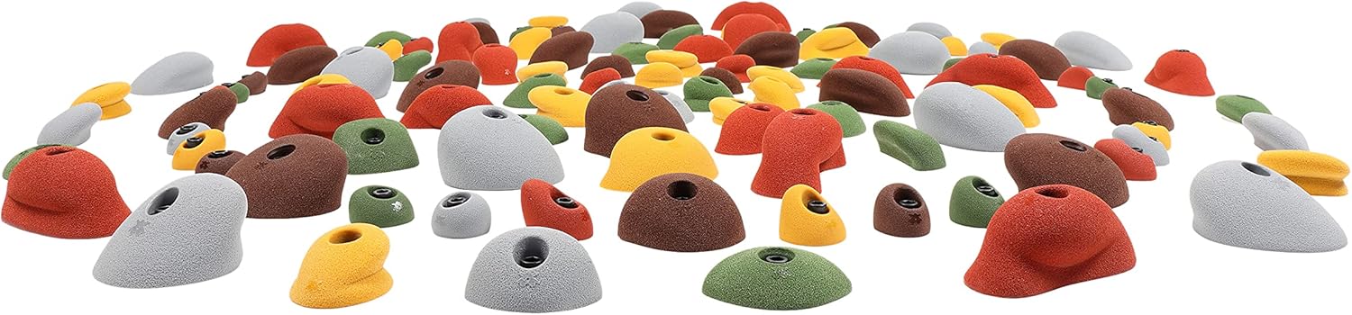 The 115 Steep Wall Footholds Rock Climbing Set includes: 115 Rock Climbing Holds115 Indoor Rated 3/8" Allen Head Socket Cap Bolts115 Zinc 3/8" 4-prong t-nuts1 x 5/16" L-Bar Wrench Description: The 115 Steep Wall Rock Climbing Holds consists of steep wall footholds, small edges, incuts, crimps, pinches, jugs, and slopers. These specific holds excel on climbing walls that are vertical and steep. For the beginner, the 115 pack is an excellent choice for vertical walls. This set will introduce you to a variety of grips that will be challenging but not impossible. The feet are big for a vertical wall, and the grips are all incut. Even the slopers will have an incut on a vertical wall. This is an excellent "Welcome to Climbing set." Expect V1/2 on vertical walls, which is a whole step of difficulty above putting easy holds on your wall. The climbing holds are all directionally shaped, so a little bit of rotation can change their difficulty with minor adjustments. Route set with these holds in steep terrain, and you will get V3 to V6 feeling problems. Rock on; the intermediate climber won't be disappointed. Color: Assorted Earth Tones (Rust, Gray, Moss Green, Gold, Brown) Texture: The texture offers a skin-friendly grip that feels like natural rock. Origin: Made in the USA with a premium-grade non-toxic polyurethane resin. All of our products come with our 30-day return policy money-back guarantee. Size: Ranging from small footholds to large handholds. Weight 57.1 Pounds Warranty: Limited Lifetime Category: Climbing Holds