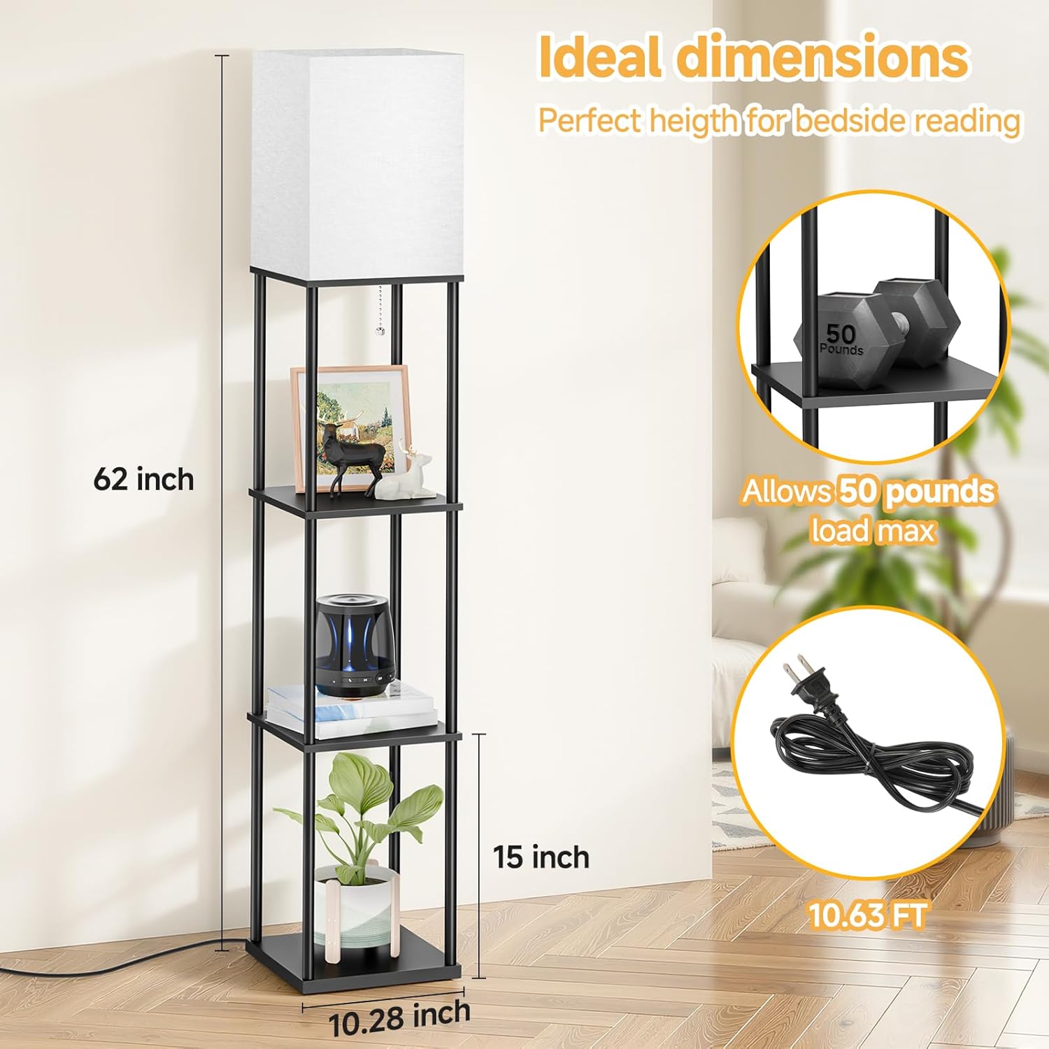 | Additional Features | 3-in-1 Shelf Floor Lamp, 3-tiered Display& Storage, 3000K/4000K/5000K Bulb Included, 50lb Support Max, Pull Chain Design |