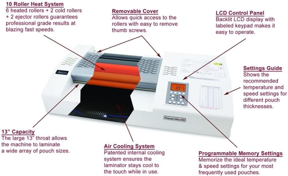 Akiles APLULTRA-X10 Model ProLam Ultra-X10 Commercial Grade 10 Roller Laminator with 2 Programmable Memory Settings, 13" (330 mm) Throat Capacity, 14 mil (350 mic) Max Pouch Thickness The Akiles ProLam Ultra-X Series laminators possess superior quality and functionality combined with commercial grade design. Its multiple roller heat system produces professional, crystal-clear and bubble-free pouches every time. Key Features - Programmable Memory Settings: Allows you to save the ideal temperature and speed for your most frequent projects - Blazing Fast 10 Roller Heat System: The 10 roller heat system grants you one of the fastest laminating speeds in its class (i.e. 142" per minute). 6 heated rollers + 2 cold rollers + 2 ejector rollers guarantees professional grade results at blazing fast speeds - Auto Shutoff: Automatically cools and shuts down the machine after usage, to prolong the life of your laminator - 13" Capacities: The large 13" throat allows the machine to laminate a wide array of pouch sizes - Removable Cover: Allows quick acccess to the roller with easy-to-remove thumb screws - LCD Control Panel: Backlit LCD display with labeled keypad makes it easy to operate - Setting Guide: Shows the recommend temperature and speed settings for different pouch thicknesses - Air Cooling System: Patented internal cooling system ensures the laminator stays cool to the touch while in use Specifications - Throat Capacity: 13" (330 mm) - Max Laminating Speed: 142" / min - Max Pouch Thickness: 14 mil (350 mic) - Max Laminating Thickness: 1/8" (3 mm) - Heated Roller System: 6 Hot / 4 Cold - Memory Settings: 2 Programmable (Temperature & Speed) - Speed Control: 9 Settings - Operating Temperature: 32°F – 320°F - Power Consumption: 1200W - Dimensions: 14" x 25.75" x 5.75" - Weight: 57 lbs (26 Kg)