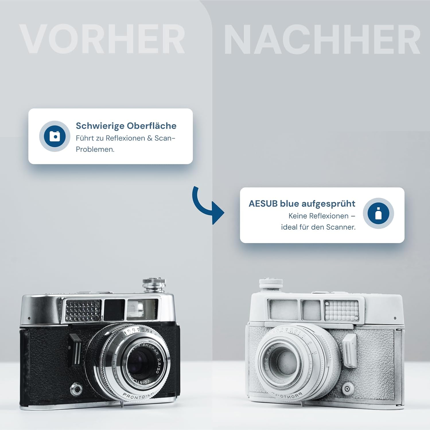 AESUB blue is a self-vanishing scanning spray developed by scanning experts. The spray evaporates within a few hours, meaning that there is no need for cleaning after scanning. Unlike traditional sprays, AESUB blue does not contain pigments and thus avoids pigment-contamination of sensitive areas, such as laboratories and production sites, equipment and users. You can therefore apply AESUB blue directly, on spot of scanning, without any costly transport to avoid said pigment-contamination in sensitive areas. Overall, AESUB blue greatly increases efficiency and productivity within the digitizing processes.