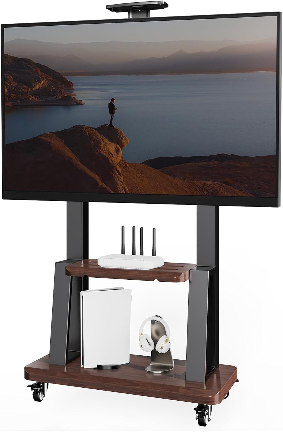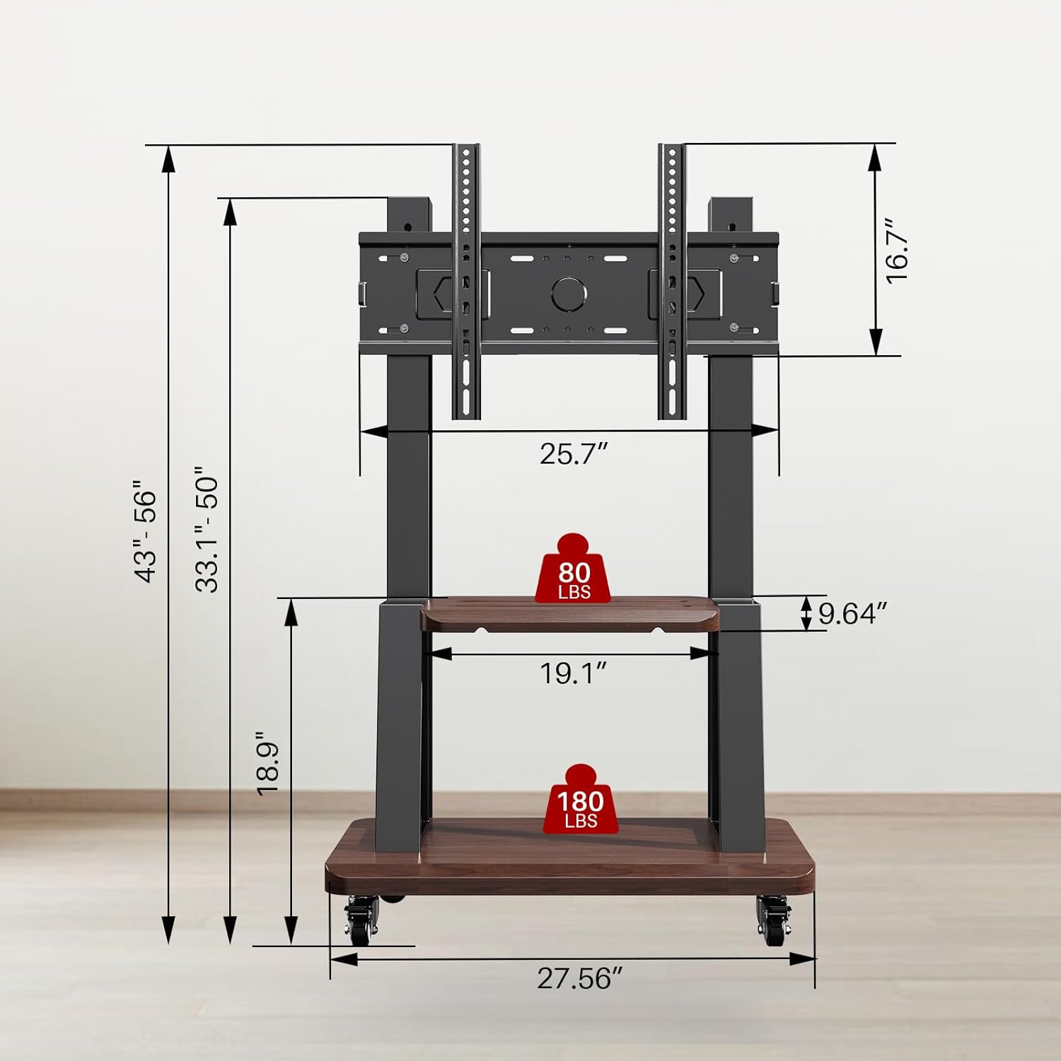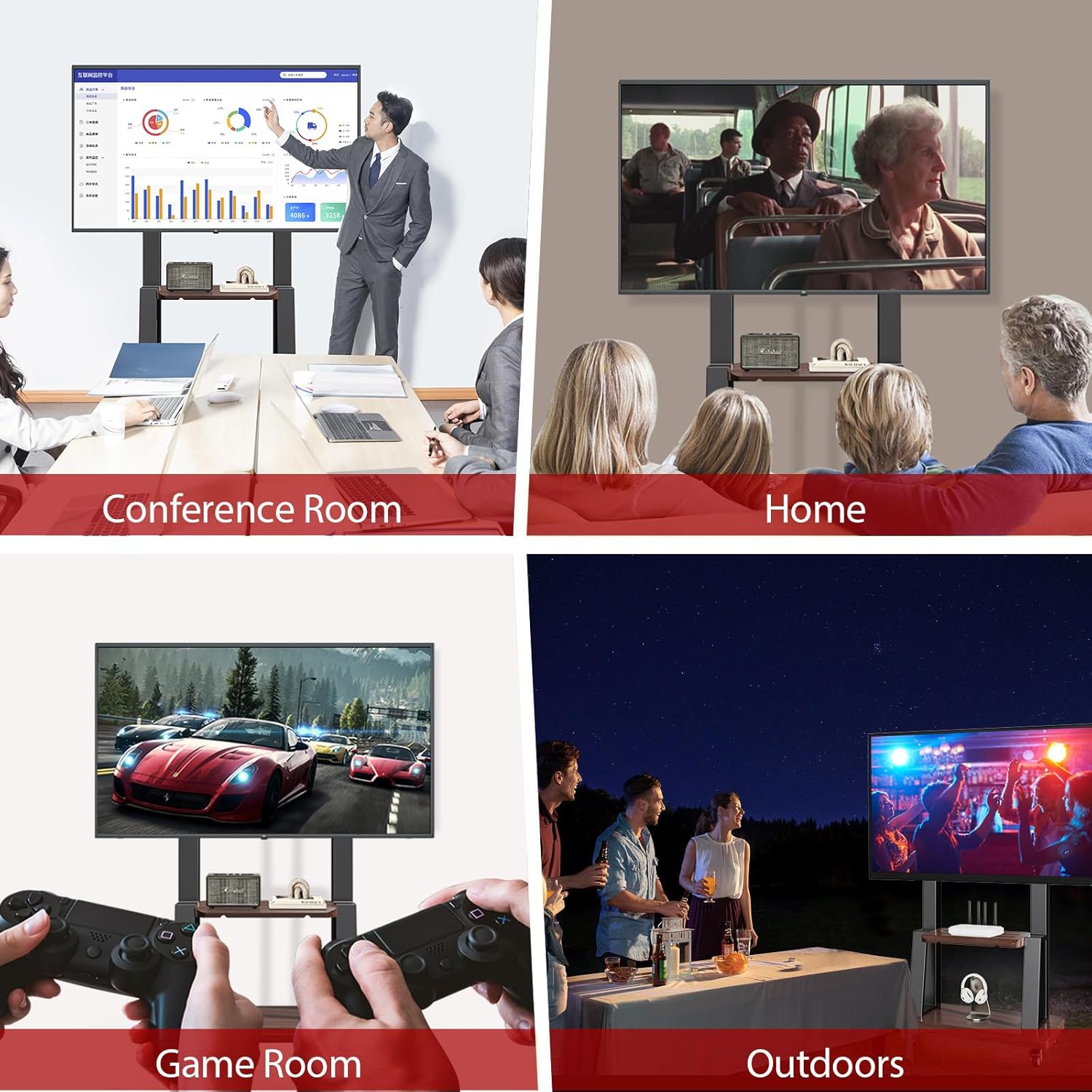 • Make Your TV Mobile : Mobile TV cart with wheels, make your TV mobile. Move it wherever you want. No more mounting your TV on the wall or making holes in the wall. Designed with locking wheels to make it easy to move and stable for added safety, you no longer have to struggle with awkward angles or try to move your TV from room to room, our cart is perfect for home, bedroom, office, shopping malls, conference rooms, hotels, outdoors and more.