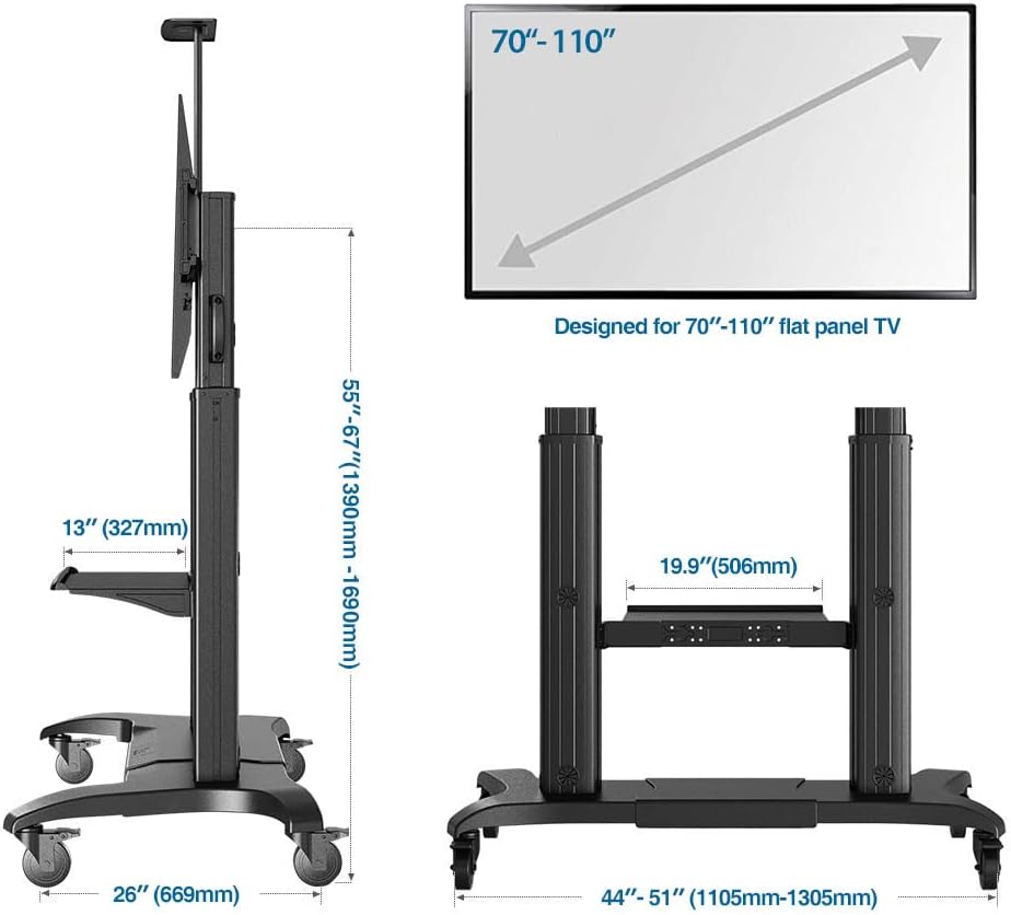 • ☑ UNIVERSAL ROLLING TV CART: Fit most 70"-110" LCD LED OLED Flat Screens with universal VESA patterns from 200x200mm to1000x600mm, Adjustable base makes it better to adapt to different TV loads