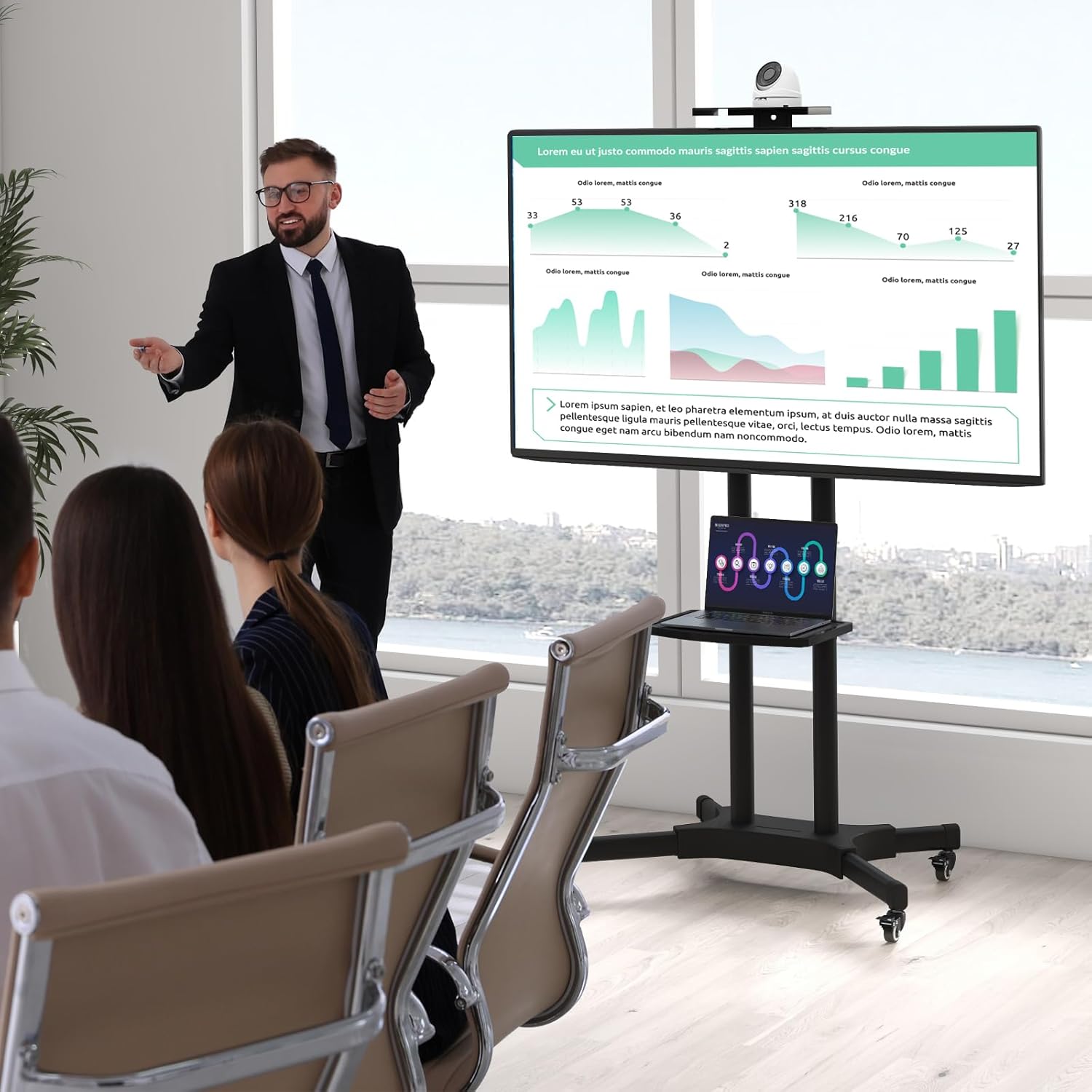 Description: Discover the ultimate convenience with this mobile TV stand for both indoor and outdoor use! Made with a high-grade metal frame and equipped with an X-shaped base, this portable TV stand is especially durable, stable, and sturdy, making it suitable for TVs of different sizes. Moreover, featuring a user-friendly height adjustable design, the TV stand can be easily adjusted to the perfect height of your TV to create the ultimate viewing angle. The top tray and laptop shelf for placing your things are also height adjustable, providing added convenience. Enjoy a TV stand that is designed with movable and space-saving design in mind with its short rear feet that save precious space and 4 lockable wheels with smooth mobility. Lastly, there are also other thoughtful and considerate details, such as the cable management that organizes all kinds of wires. Features: Height-adjustable mounting plate provides 10 heights for the best viewing experience Height-adjustable shelf means that you do not need to bend over Cable management helps you organize the cables from TVs and other electronics Height-adjustable top tray holds a camera to record meetings Middle storage shelf is designed for needed electronics With an applicable VESA size of 200x200mm-600x400mm Suitable for TVs of different sizes of 32"-83" Stable X-shaped base ensures the stability of the TV stand Heavy-duty metal frame with a maximum load capacity of 110 lbs 4 lockable universal wheels can move to different scenes at any time according to your needs Low-profile rear feet save precious room space Perfect for gaming, watching TV, having a conferences, exercising, and more! Easy to assemble with the help of a detailed user’s manual Specifications: 【Fits TV Size: 32"-83"】 Color: Black Material: Metal Product Dimensions: 31" x 21" x 71" / 78.5 cm x 54 cm x 180 cm (L x W x Max. H) Top Tray Size: 10" x 5" / 25.5 cm x 12.5 cm (L x W) Middle Shelf Size: 14.5" x 11" / 37 cm x 28 cm (L x W) Mounting Plate Size: 26" x 16" / 66.5 cm x 40 cm (L x W) Middle Shelf Height: 12"-27.5" / 30 cm - 70 cm Mounting Plate Height (from Middle Part): 39.5" - 57" / 100 cm - 145 cm Suitable TV Size: 32"-83" VESA Size: 200x200mm-600x400mm Weight Capacity of TV Stand: 110 lbs / 50 kg Weight Capacity of Top Tray: 22 lbs / 10 kg Weight Capacity of Middle Shelf: 22 lbs / 10 kg Net Weight: 26.5 lbs / 12 kg 【Fits TV Size: 32"-85"】 Color: Black Material: Metal Product Dimensions: 32" x 23" x 76" / 82 cm x 59 cm x 193.5 cm (L x W x Max. H) Top Tray Size: 10" x 5" / 25.5 cm x 12.5 cm (L x W) Middle Shelf Size: 17.5" x 13.5" / 45 cm x 34 cm (L x W) Mounting Plate Size: 26" x 16" / 66.5 cm x 40 cm (L x W) Middle Shelf Height: 10" - 29.5" / 26 cm - 75 cm Mounting Plate Height (from Middle Part): 39.5" - 57" / 100.5 cm - 145.5 cm Suitable TV Size: 32"-85" VESA Size: 200x200mm-600x400mm Weight Capacity of TV Stand: 132 lbs / 60 kg Weight Capacity of Top Tray: 22 lbs / 10 kg Weight Capacity of Middle Shelf: 22 lbs / 10 kg Net Weight: 39 lbs / 17.5 kg Package Includes: 1 x Mobile TV Stand 1 x User’s Manual