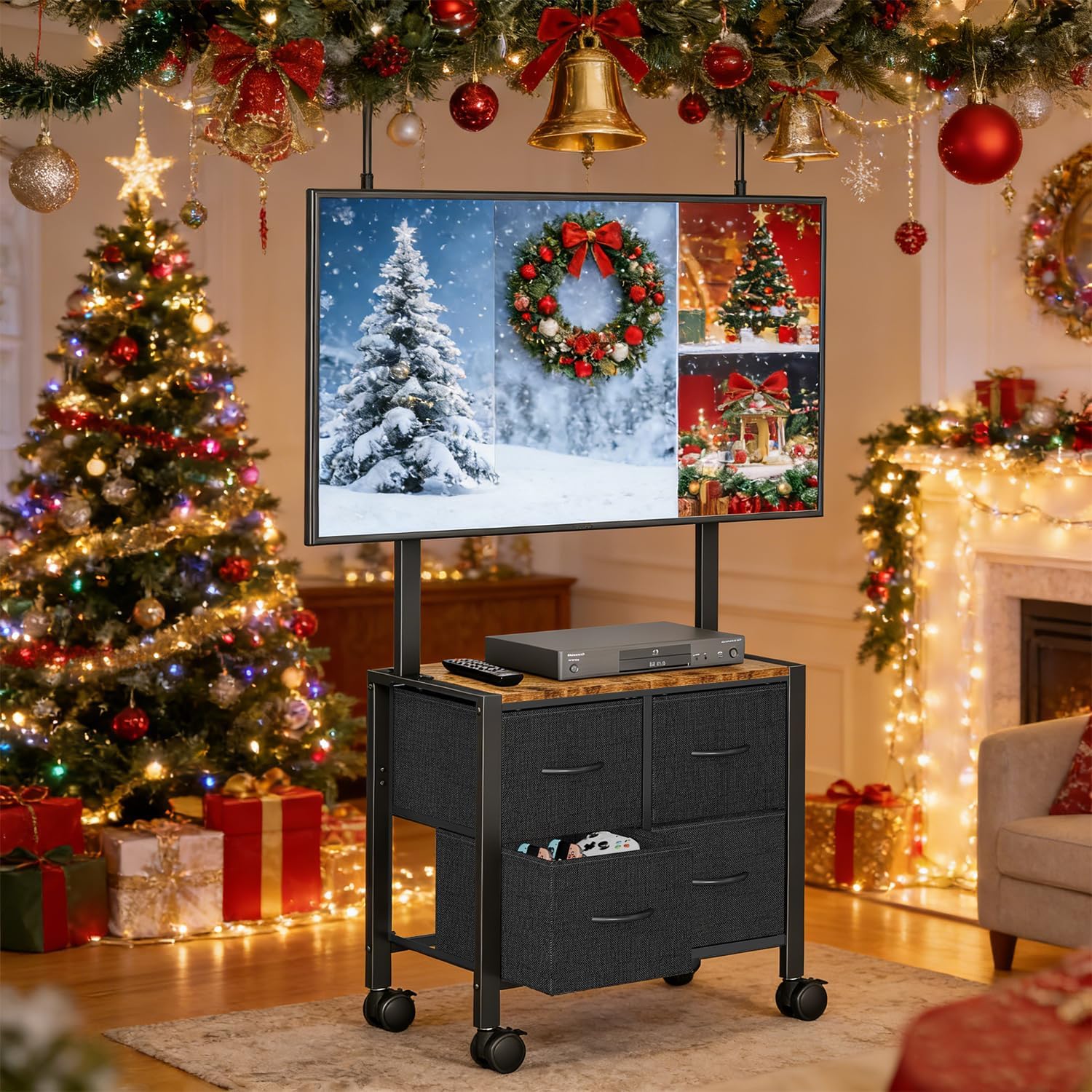 • 【TV Stand with 4 Fabric Drawers 】: Is your countertop of TV stand always cluttered? Let this rolling TV stand with four fabric drawers solve the problem! Say goodbye to the mess on your TV console. Featuring four pull-out fabric drawers, this movable TV cart helps you easily organize game discs, remote controls, stationery, and other small items. Keep everything in order and within reach, creating a clean and tidy surface for a more comfortable and spacious living experience.