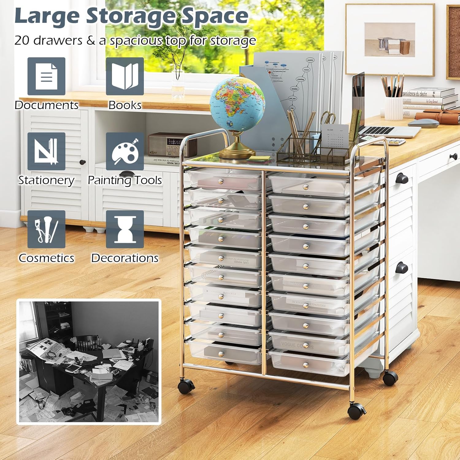 Description:Are you looking for a storage cart to place your files in order? HOMGX drawer cart is a good choice! HOMGX rolling storage cart is a versatile and practical solution for organizing and storing your belongings. With its 20 spacious drawers, larger than A4 paper size, it provides ample space for paper, documents, or children's toys. The cart is supported by a durable chrome finished steel frame, capable of holding up to 22lbs.The utility cart features portable handles, convenient knobs for easy pulling, and 4 swivel wheels with 2 lockable brakes for stability. The cart is easy to assemble and clean. Suitable for teachers, parents, beauticians, craftsmen, and artists.Features:20 spacious drawers provide large capacityDurable metal frame to keep stable and sturdyPortable carrying handle for comfortable grip and pullConvenient knobs, allowing for effortless pulling4 wheels can be swiveled 360 degrees and moved silentlyPush down the toggles on the wheels can fix the drawer cartWith detailed instruction, the rolling cart is easy to installWaterproof PP material is easy to clean with dry or damp clothGreat for storing files, paper, toys , pens and other itemsSuitable for home, office, art studio, beauty salon and so onSpecifications:Color: ClearMaterial: Polypropylene, Metal, Steel, PlasticOverall Dimension: 25" x 15" x 35" (L x W x H)Inner Dimension of Each Drawer: 13" x 10" x 2.5" (L x W x H)Weight Capacity of Top Platform: 22 lbsWeight Limit of Small Drawer: 3 lbsNet Weight: 18.5 lbsPackage Includes:1 x 20 Drawers Rolling Cart1 x Instruction