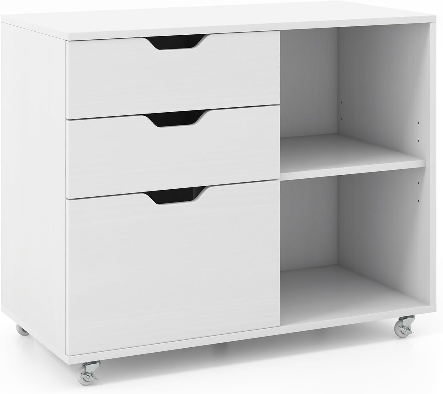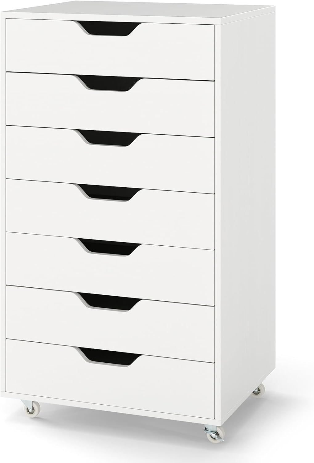 DescriptionWorried about the countless files in your home or office? It's time to buy a file cabinet. The spacious cabinet top can accommodate printer, telephone or lamp. 7 large storage drawers can accommodate your office supplies. Made of high quality thickened boards, the cabinet ensures durability in a long time. Moreover, the 4 universal wheels at the bottom make it easy to move and 2 of them can be locked to get it still. This simple modern mobile filing cabinet is suitable for various home or office scenarios and will undoubtedly bring great convenience to your daily work and life.Features·7 large storage drawers with ample storage space·4 universal wheels ensure you can flexibly move around·2 lockable casters allow you to get the cabinet still·High-quality thickened boards make up a stable structure·Flexible sides and cut-out handles for easy access to items·Smooth cabinet top for easy cleaning and maintenance·Detailed instruction easy to clean·Multifunctional cabinet not only as a filing cabinetSpecificationMaterial: Engineered Wood, MDFOverall Dimension: 19.5’’ x 16’’ x 34.5’’/49cm x 40cm x 87cm(W x D x H)Net Weight: 56.4 lbs/25.6kgWeight Capacity of Top: 44 lbs/20kgWeight Capacity of Each Drawer: 11 lbs/5kgPackage Includes:1 x File Cabinet1 x Instruction