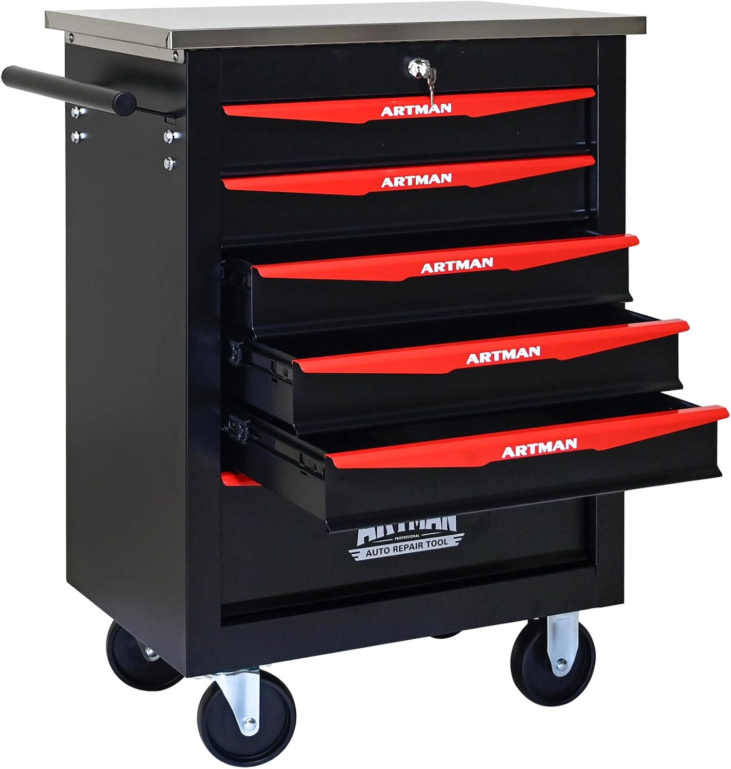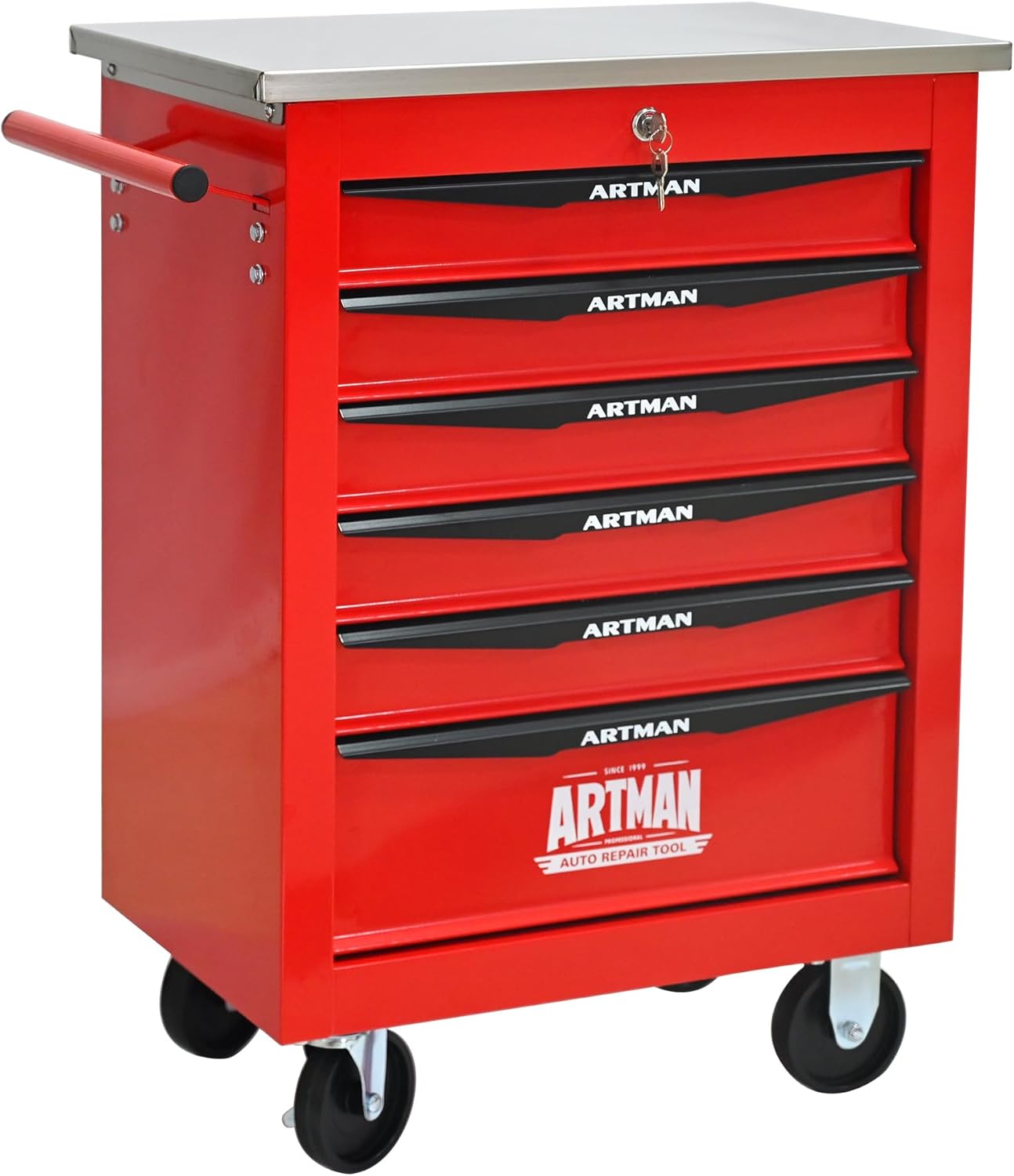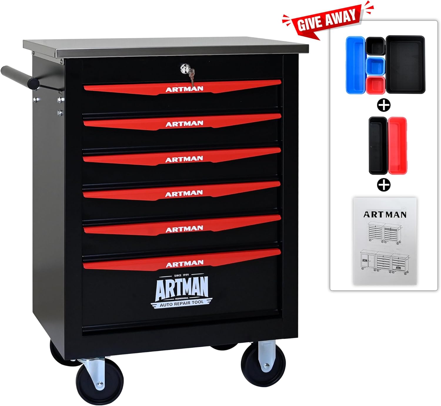 Proudct Name: 6 Drawers Workshop Tool TrolleyMaterial: Cold Rolled SteelSurface Finish: Powder CoatingPowder Coating: 4" Casters (2PCS with brake and 2PCS without brake)Product Size (with wheels and handle) 24.61*13.58*30.71INCHProduct Size (without wheels and countertops) 20.63*12.99*25.16INCHPackage Size: 23.31*15.35*28.66INCHColor: Black+RedNet Weight: 54.90LBSGross Weight: 59.30LBS
