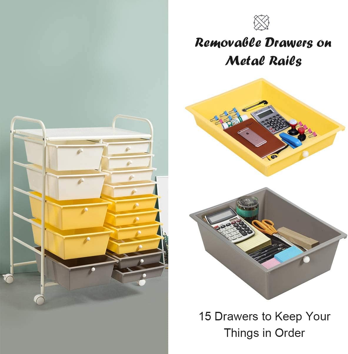 Description:Is there too many small things in your house and no place to put them?Is it difficult for you to move the items in the cabinet to another place?Have a look at this 15 drawer rolling storage cart organizer. With this multipurpose mobile trolley, your problem would definitely be easily solved. 5 big drawers and 10 small drawers satisfy your different storage needs. And the four universal wheels make the moving process more convenient and easy. Besides, the interlock system help you stop the mobile trolley at any time. And it equips a electroplated steel frame, which make the rolling storage cart durable and sturdy for long term use. Moreover, the stylish appearance could easily match your home decoration and make your space charming.Take it home and enjoy a convenience lifestyle.Feature: Colorful design make your space stylishTall handles make it easy to push and pullThe interlock system brings more convenienceDetailed instruction make assembly procesee easyThe electroplated steel frame ensure the durabilityBig and small drawers meet your different storage needsFour universal wheels allow you to easily change the direction of movementSpecification:Color: As the picture showsMaterial: Steel, PPDimension: 25”x 14.5”x 34.5”(L x W x H)Net Weight: 17 lbsPackage Included:1 x 15 Drawer Rolling Storage Cart