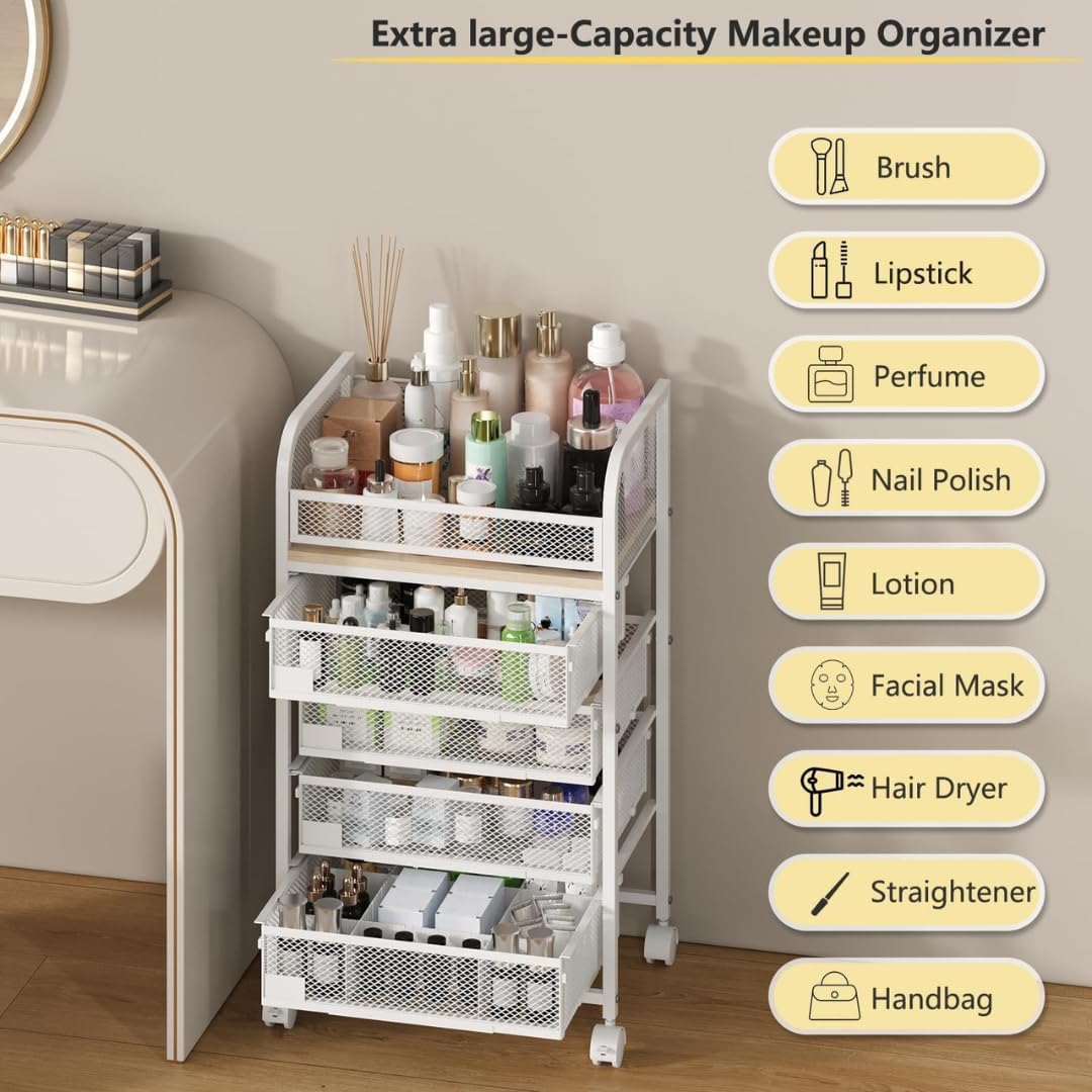 Spacious & Customizable Storage System - This large-capacity organizer (16.3"L x 11.4"W x 27.5"H) features 4 drawers with movable dividers, allowing you to create custom compartments for lipsticks, nail polish, and perfumes. The open top shelf offers quick access to frequently used items like brushes and lotions.