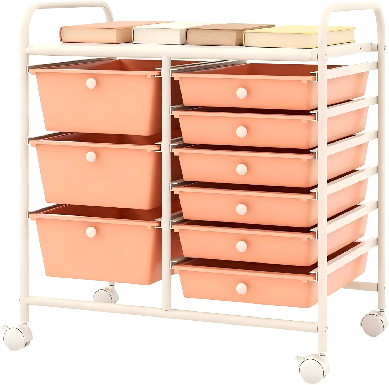 Description: This 9-drawer rolling cart features a tiered storage design that combines categorization, mobility, and space efficiency, making it suitable for offices, homes, and dorm rooms. With compact dimensions of 25" L × 14.5" W × 24.5" H, its slim profile allows it to fit neatly under desks or in corners to maximize space utilization. The electroplated metal frame and PP plastic drawers give the unit a sturdy construction that holds its own against the demands of daily use. Equipped with four swivel casters—two featuring locking mechanisms—it moves smoothly and can be secured in place when needed. The 21.5"-high top tray allows easy access to frequently used items without bending, and the built-in handles enable smooth drawer operation. Designed for practicality and ease of use, this storage trolley helps maintain an orderly and accessible storage space. Features: Nine tier storage system with top platform and multiple drawers Thickened steel frame with electroplated finish resists corrosion Four swivel casters include two with locking mechanisms Top platform supports up to 22 pounds for heavy items Narrow 25" profile fits neatly under desks and in corners 21.5" top height allows comfortable access without bendin Smooth gliding drawers feature integrated handles for easy use Specifications: Color:Black,Clear,Macaron,Hot Pink,Pink,White Material: Metal, PP Overall Dimension: 25" x 14.5" x 24.5"(L x W x H) Large Drawer Dimensions: 14.5" x 11.5" x 5" (L x W x H) Small Drawer Dimensions: 14.5" x 11.5" x 2.5" (L x W x H) Weight Limit of Tabletop : 22 lbs Weight Limit of Large Drawer: 3.5 lbs Weight Limit of Small Drawer: 2 lbs Net Weight: 10 lbs Package Includes: 1 x 9-Drawer Rolling Cart 1 x Instruction