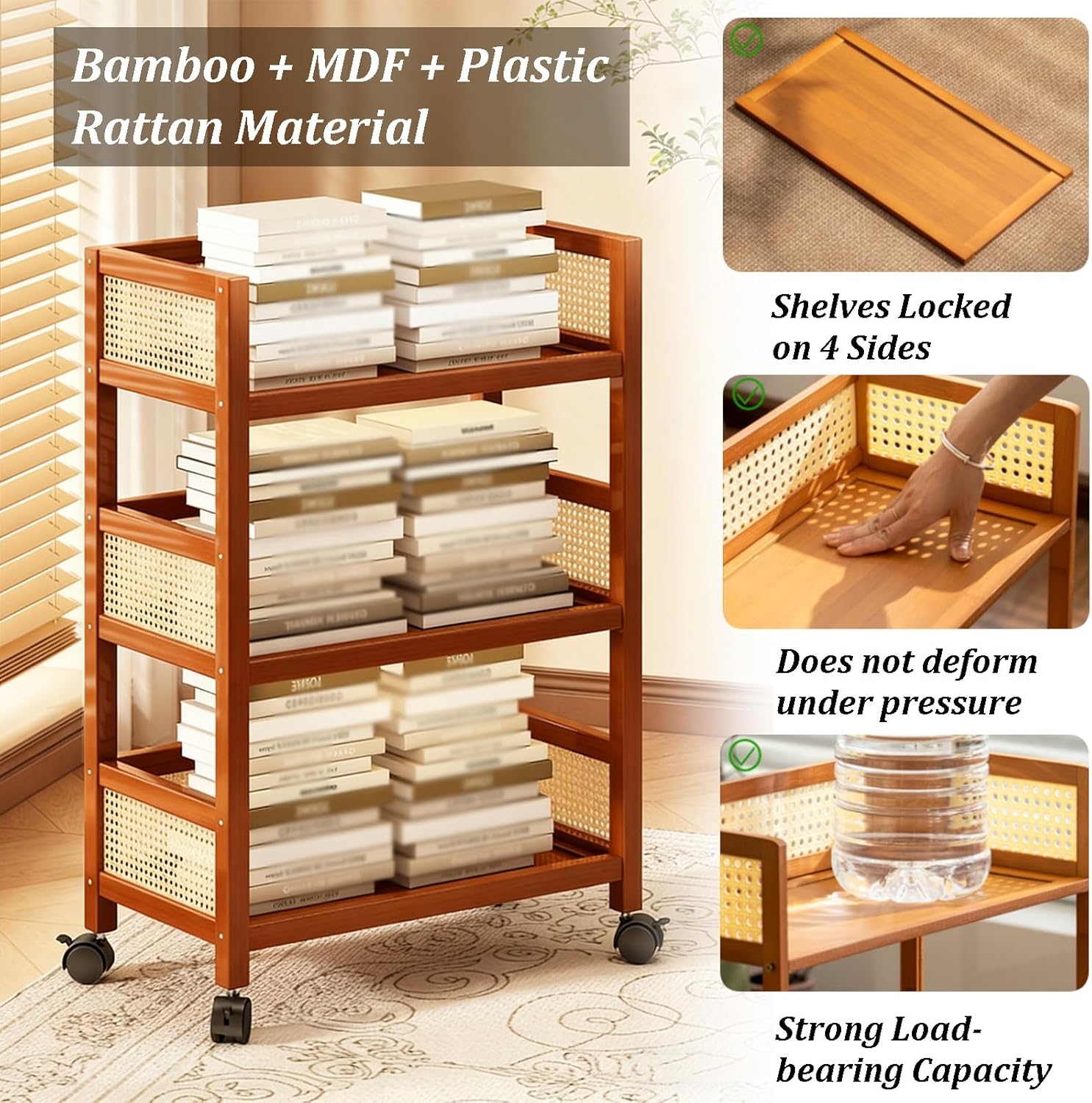 This rolling book cart offers large-capacity and multi-functional storage with subdivided compartments and a convenient top shelf for placing items. It's portable and easy to move, featuring 360° rotating silent wheels with built-in brakes. Durable and sturdy, it's constructed from multiple materials and has side locking mechanisms to prevent deformation. Three-sided raised guardrails prevent items from falling during transport. Thoughtful design details include hand-polished rounded corners with a smooth, burr-free surface to prevent collisions and scratches.Product name: Rolling Library Book CartColor: BrownMaterial: Nan Bamboo, MDF, Plastic RattanSize: 30/50/70*25*81.5cm(11.81/19.69/27.56*9.84*32.09in)Tiers: 3Shape: RectangularFeatures: Portable, Easy to move, Space-SavingStyle: ModernInstallation method: Floor-standingIndoor Outdoor Usage: Indoor OutdoorApplicable scope: Suitable for living rooms, bedrooms, studies, offices, libraries, dormitories, classrooms, etc.It can be used as a bookshelf, entryway shoe rack, snack rack, bedside table, flower stand, sofa corner table, storage shelf, etcIt can store books, documents, magazines, CDs, stationery, shoes, etc.Package:1* Movable Bookshelf Organizer Rack