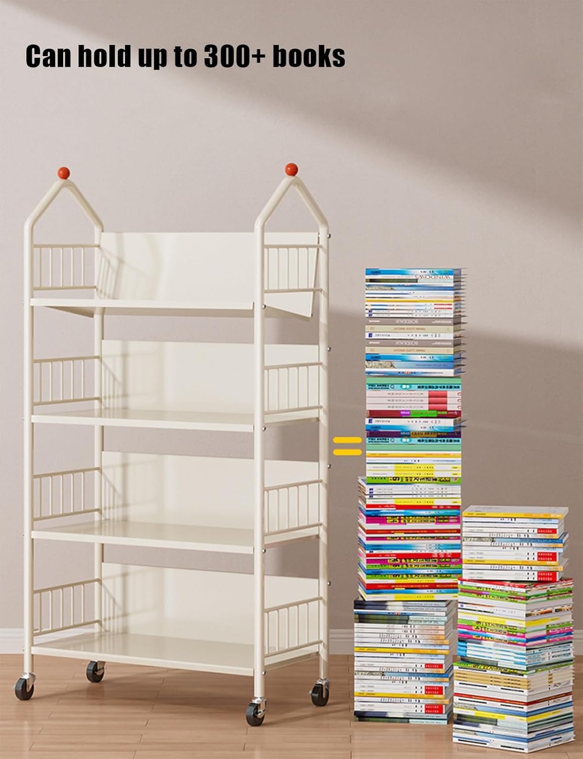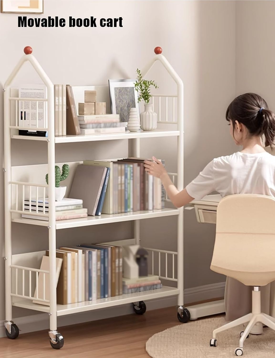 1. About the ProductOur children's bookshelf features a castle-inspired design with a sturdy triangular frame, blending modern and classic elements. Constructed from 20mm thick carbon steel, it features solid shelves and thickened steel pipes. It has a total load capacity of approximately 100kg and can accommodate approximately 100-200 books, even large textbooks. Its silent wheels are floor-friendly and offer two installation options (flat or tilted), making it suitable for various scenarios. Its rounded corners are gentle on hands, allowing for easy access near a desk.2. InstructionsAssembly: Choose between flat or tilted installation, quickly assembling with a screwdriver.Movement: Gently push the silent wheels for flexible maneuvering.3. SpecificationsMaterial: 20mm thick carbon steelNumber of shelves: 2-Tier/3-TierTotal load capacity: 100kgInstallation: Shelves flat or tiltedMovement: Silent wheelsUseful for: Desks, children's rooms, living rooms, etc.4. Package Contents: 1 Book Cart