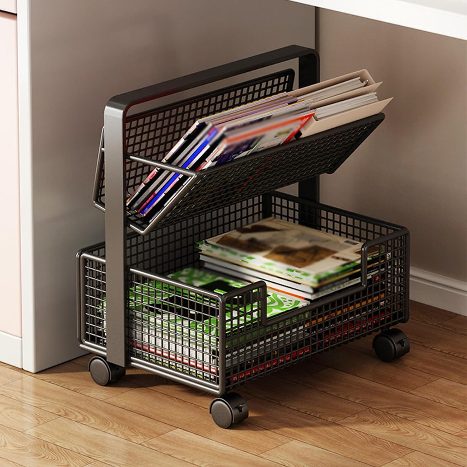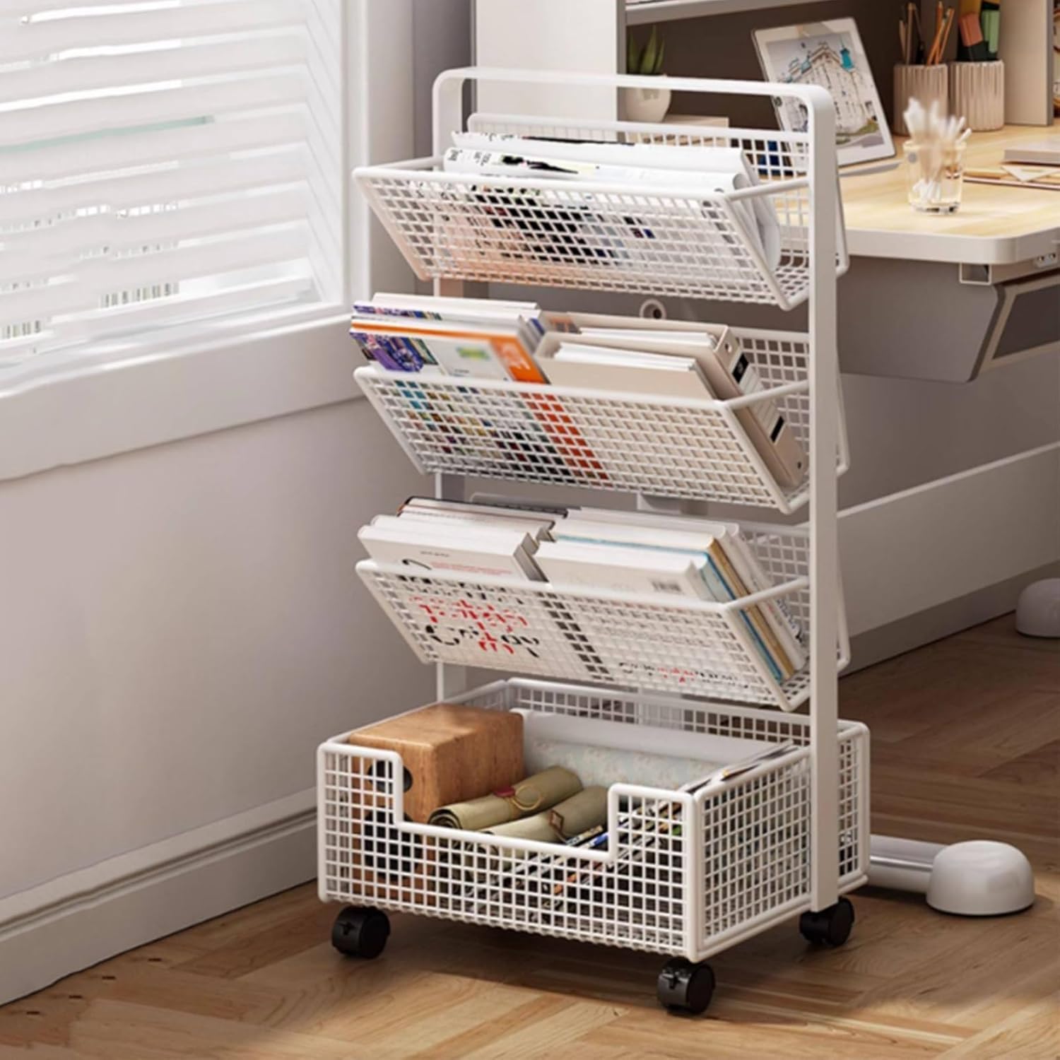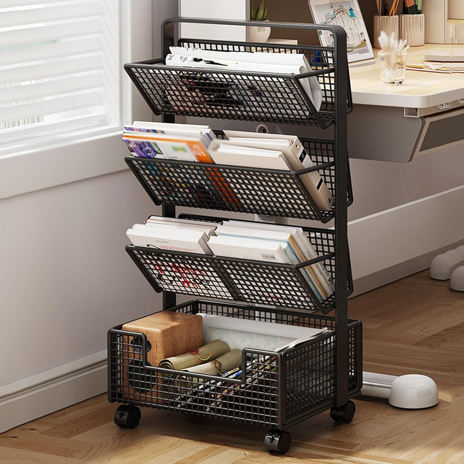 This rolling library cart features a multi-tiered storage design, maximizing vertical space. Its angled shelves and slim body, approximately 23cm deep, allow it to fit easily into narrow spaces. Made of wrought iron, it is sturdy, durable, waterproof, and easy to clean. Equipped with silent, wear-resistant casters and built-in brakes, it moves smoothly and flexibly. The cart has rounded corners, hand-polished to be free of burrs, preventing bumps and scratches. It is suitable for various settings and can store a variety of items, and can even be used as a versatile piece of furniture.Product name: Rolling Library Book CartColor: Black, WhiteMaterial: Carbon steelSize:32*23*35/50/65cm(12.6*9.06*13.78/19.69/25.59in)Tiers: 2/3/4Shape: RectangularFeatures: Portable, Easy to move, Space-SavingStyle: ModernInstallation method: Floor-standingIndoor Outdoor Usage: Indoor OutdoorApplicable scope: Suitable for living rooms, bedrooms, studies, offices, libraries, dormitories, classrooms, etc.It can be used as a bookshelf, entryway shoe rack, snack rack, bedside table, flower stand, sofa corner table, storage shelf, etcIt can store books, documents, magazines, CDs, stationery, shoes, etc.Package:1* Movable Bookshelf Organizer Rack
