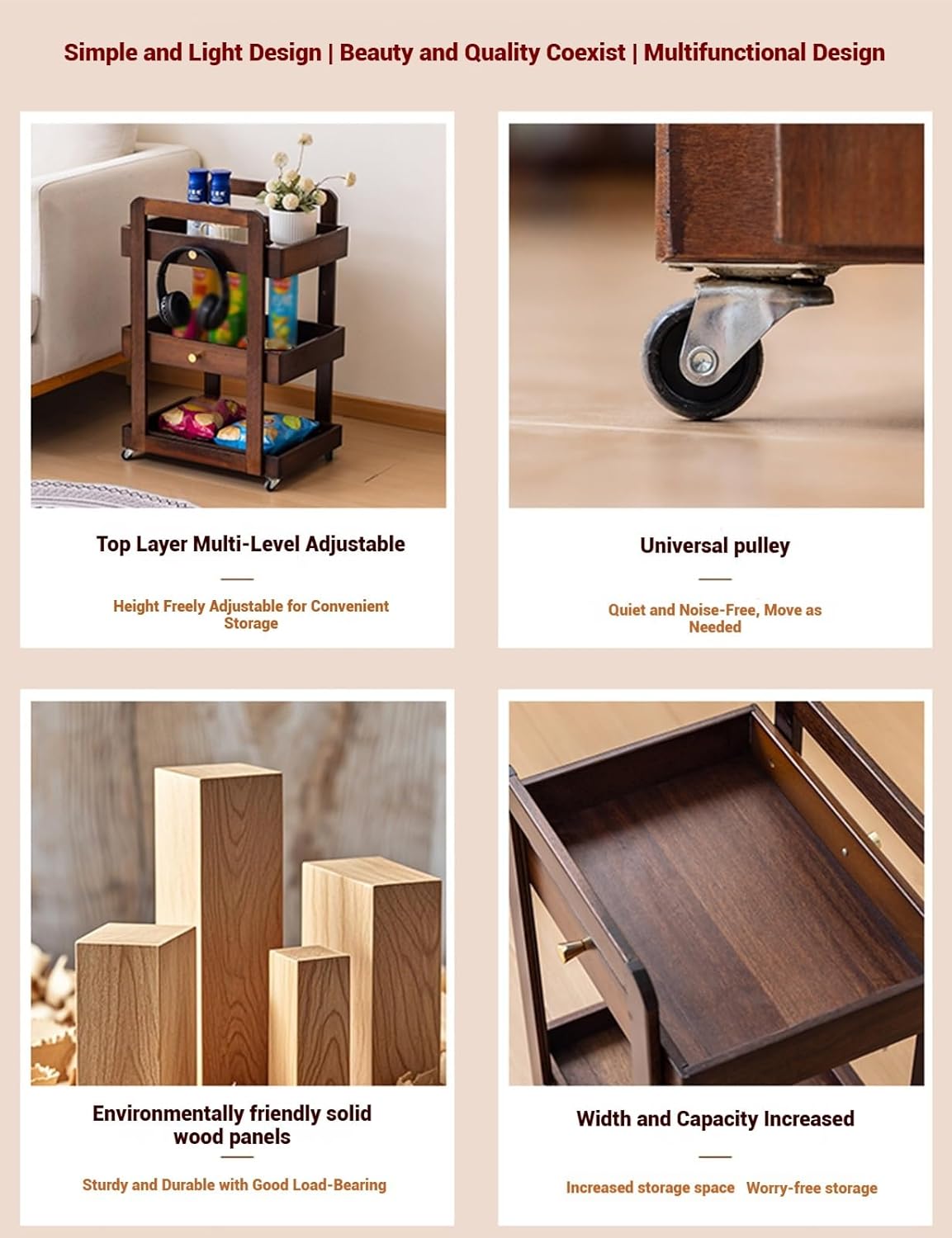 1. Product IntroductionAvailable in 2- or 3-tier designs, this sturdy teak shelf offers strong load-bearing capacity. Its surface is finished with eco-friendly wood wax oil for safety. With a 0.14㎡ footprint, the lightweight, compact shelf saves space and fits easily in living rooms, bedrooms, studies, or tea rooms. The top shelf has adjustable height to meet different storage needs. Built-in tall side rails prevent books from rolling off, while bronze hooks on the sides conveniently hold small items. 360° swivel casters enable quiet, smooth movement with lockable function. Multi-tiered compartments organize notebooks and school supplies for easy access.2. Usage InstructionsAssembly: No complex tools required. Simply assemble using included parts following the manual.Height Adjustment: Modify top shelf height based on storage needs.Movement & Locking: Push gently to move. Engage casters' brakes to secure in place.3. PrecautionsWeight Capacity: Total load should not exceed 50kg. Avoid stacking excessively heavy items.4. Product SpecificationsMaterial: Rosewood (finished with wood wax oil)Layers: 2-tier / 3-tierFootprint: Approx. 0.14 m²Top Shelf Design: Height-adjustable (3 positions)Mobility Features: 360° swivel castersIdeal Settings: Living room, bedroom, study, tea room5. Package ContentsBook cart x1