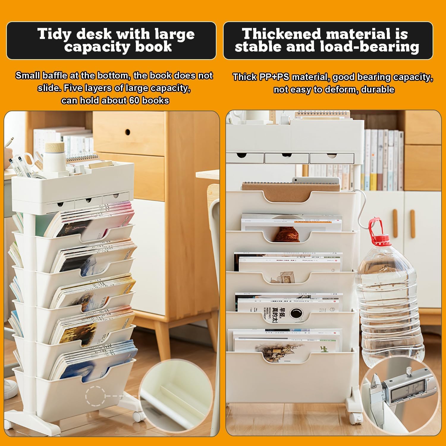 Are you constantly troubled by the clutter of your office desk? This removable desk side storage rack has wheels, large capacity, strong bearing capacity, and can be stored in different areas. It will be a good helper for your office storage! Say goodbye to the messy!Rolling Office Paper Organizer,Mobile Book Cart Document Folder File Storage with Pen HolderSpecifications:Material: PlasticColor: WhiteSize:40.4x77.8cm(16x31inch)Assembly Required: YesPackage Includes:1*6 Tier Rolling File Carts With Wheels