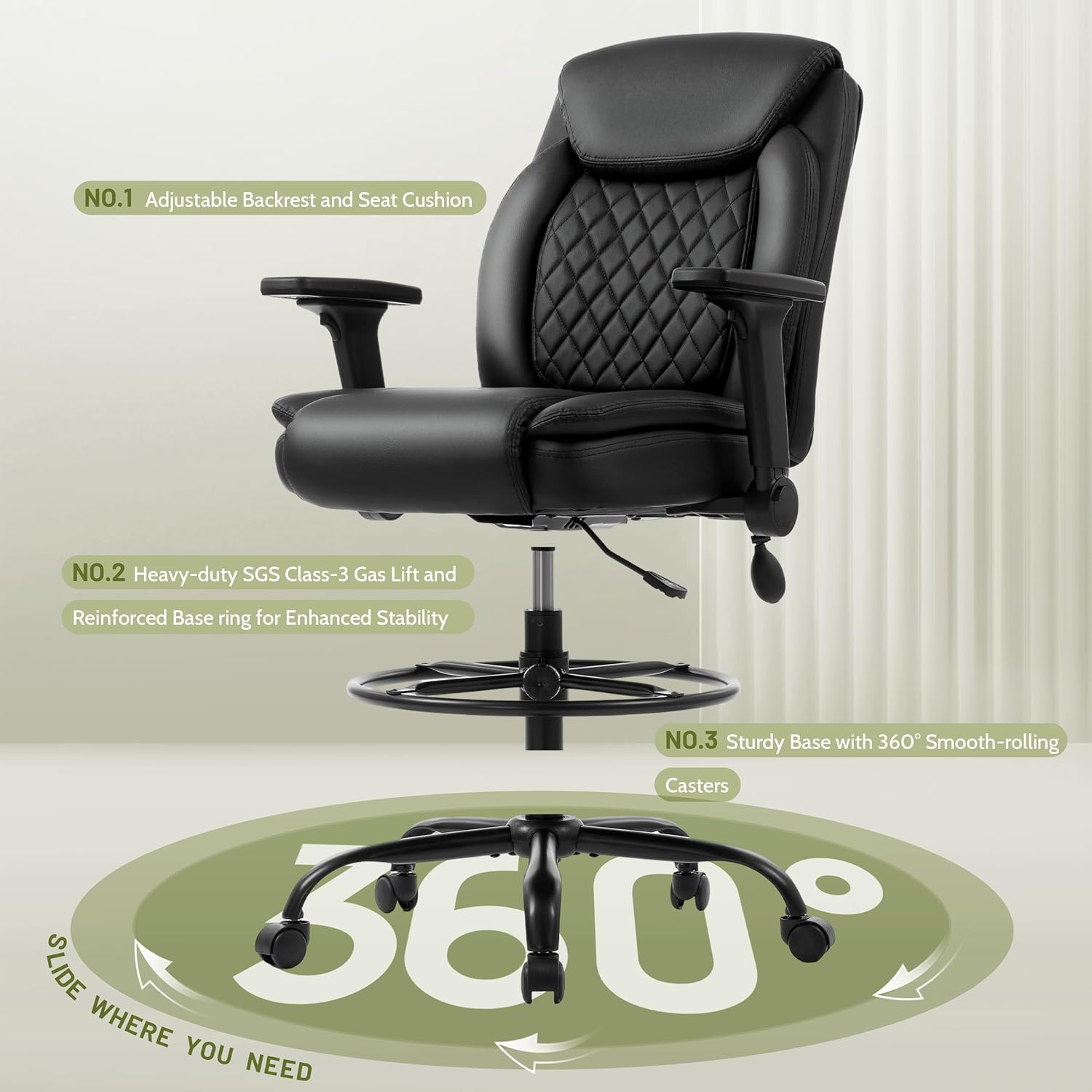 • ๐‘บ๐’•๐’“๐’†๐’•๐’„๐’‰ ๐’€๐’๐’–๐’“ ๐‘ณ๐’†๐’ˆ๐’” ๐’๐’ ๐’•๐’‰๐’† ๐‘บ๐’‘๐’Š๐’-๐’•๐’-๐‘พ๐’Š๐’ ๐‘ญ๐’๐’๐’• ๐‘น๐’Š๐’๐’ˆ Working at height? Give your feet a break! Our sturdy 19.68โ€ chrome foot ring doesnโ€™t just spin for funโ€”itโ€™s also height-adjustable (with a 4.72โ€ range) so you can fine-tune it to your perfect leg angle. With an extra-tall SGS-certified gas lift, this chair rises smoothly from standard desk height to counter height. Swivel 360ยฐโ€”all while rolling smoothly on heavy-duty dual-wheel casters. Itโ€™s mobility with stability, so you stay in control.
