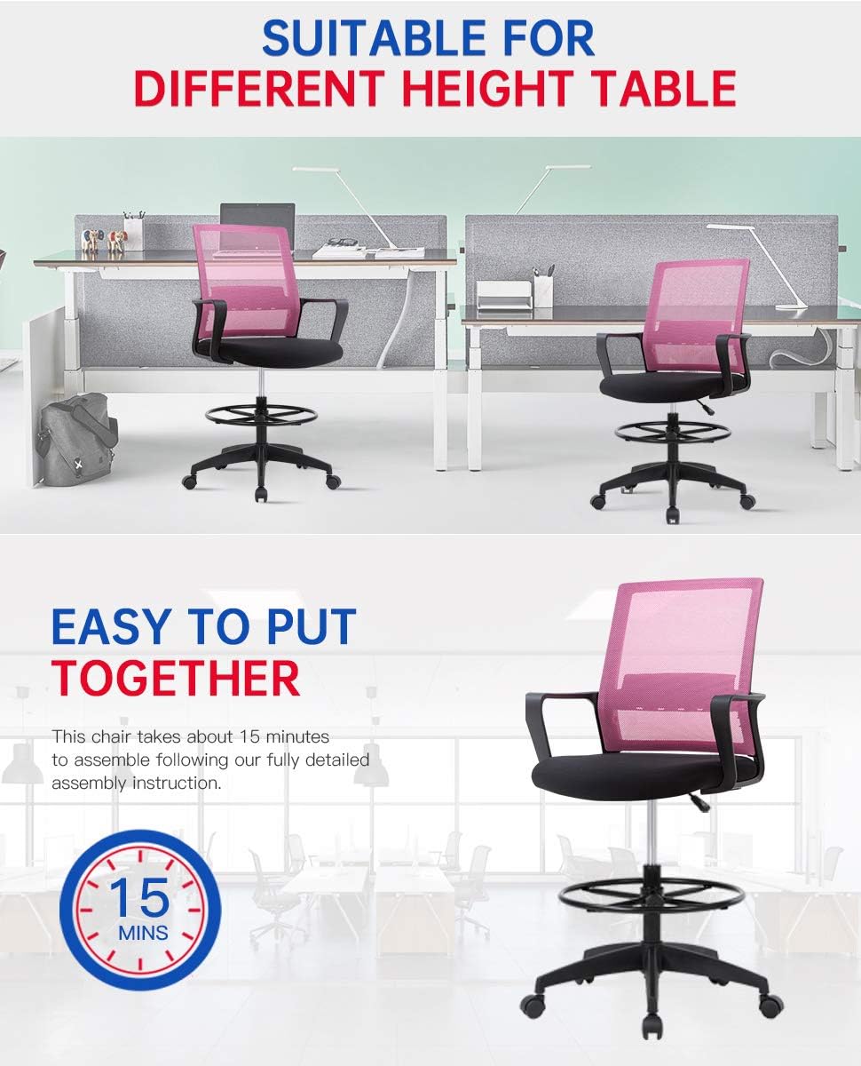 Good drafting stool has a hydraulic seat adjustment range of 20.7”-28.5” from the ground, you can practice your guitar, painting, sewing or architecture drafting with a tall chair that pairs nicely with drafting tables. In the meantime, office chair has ergonomic arms and footrest, you can relax your hand and leg while adjustable the chair.