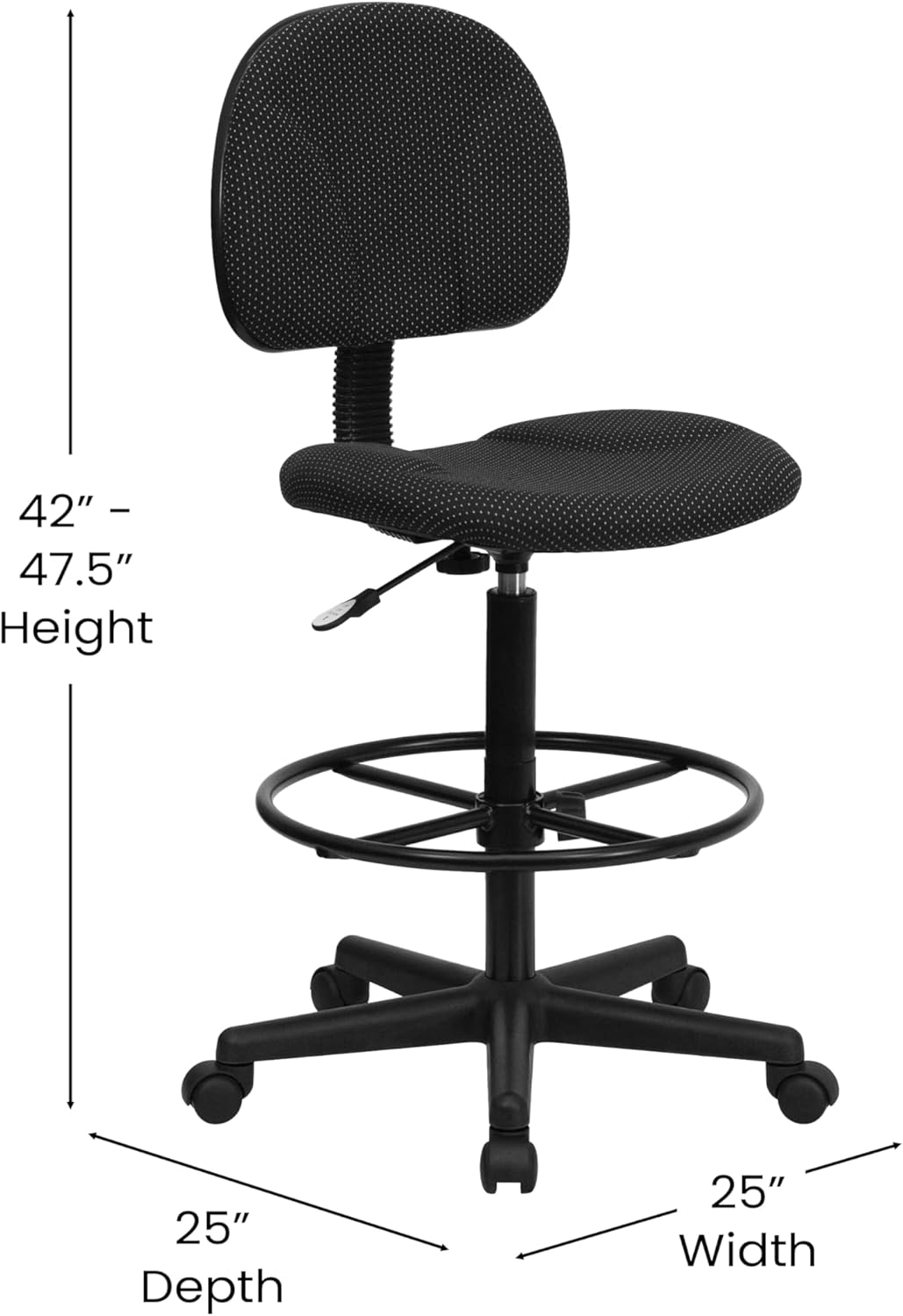 Designed for comfort, flexibility, and everyday performance, this Height Adjustable Drafting Chair is ideal for studios, offices, classrooms, and workspaces that require elevated seating. Upholstered in durable patterned fabric, the chair features a cushioned seat and supportive backrest that promotes comfort through long work sessions while supporting the mid to upper back. A height-adjustable foot ring provides added stability and ergonomic support when seated at drafting tables or standing-height desks. Built for commercial use, this chair boasts a heavy duty nylon base with dual wheel casters, holds up to 250 lbs. static weight and offers reliable performance with quick, easy assembly in 30 minutes or less. Maintenance is simple—just spot clean with a damp cloth—making it a practical seating solution for busy professional environments.