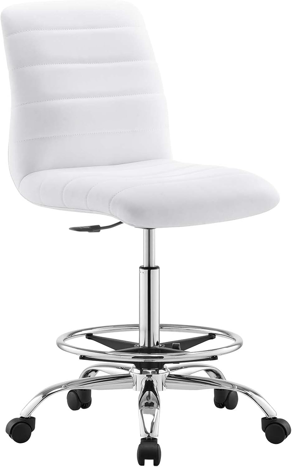 Focus on the task at hand while bringing modern style to your workspace with the Ripple Armless Drafting Chair. Outfitted with a chrome metal frame and five dual-wheel casters for easy mobility over hardwood or carpeted surfaces, this padded drafting stool is upholstered in durable vegan leather and covered in dense foam for added comfort. An ergonomic choice for workstations, this vegan leather drafting-height office chair features a mid-back design, channel tufting, and fine stitching throughout. This drafting chair is fully height adjustable with a 360-degree swivel and its drafting-height makes it suitable for standing desks, drafting tables, reception desks, and more. Assembly required. Weight Capacity: 287 lbs.