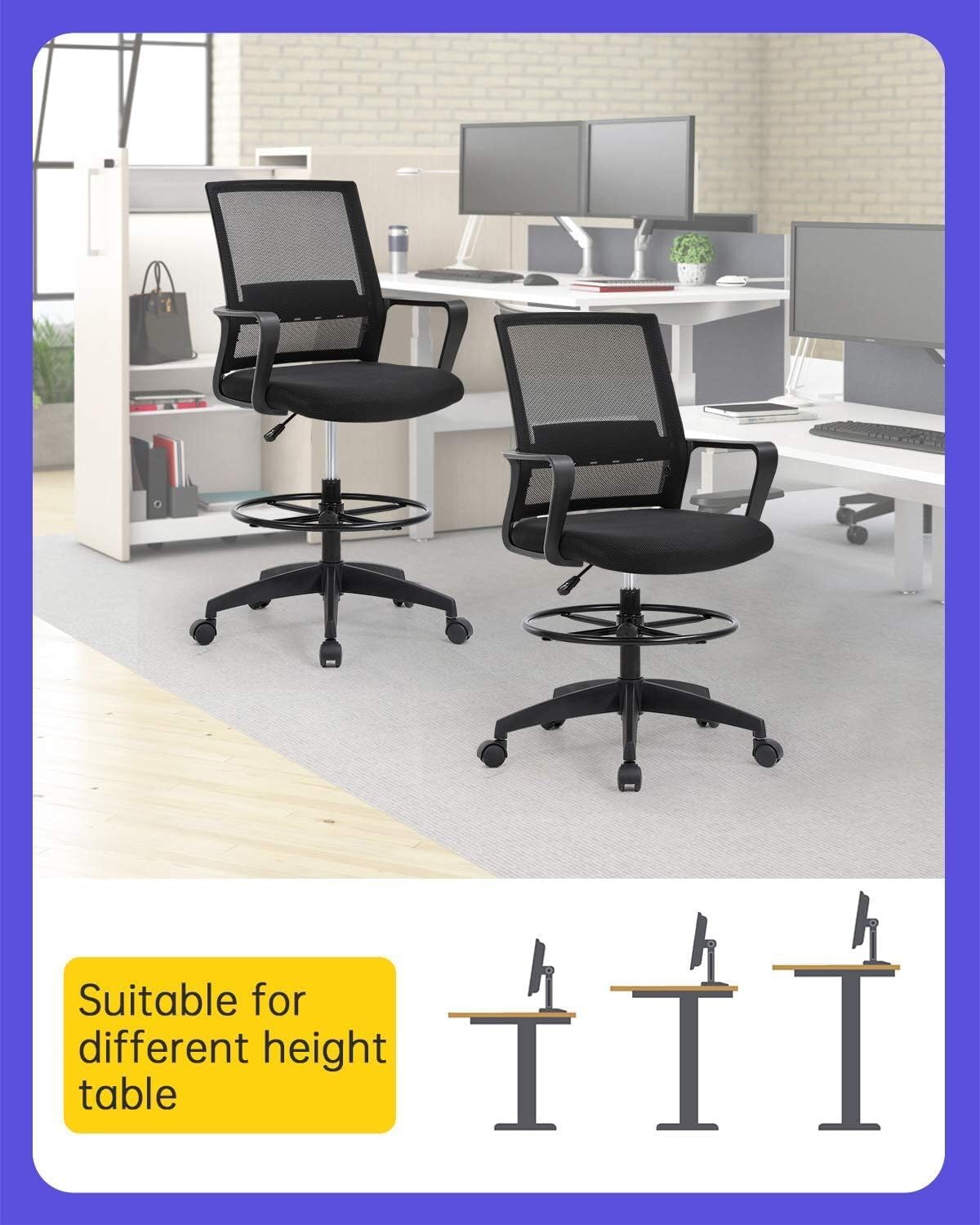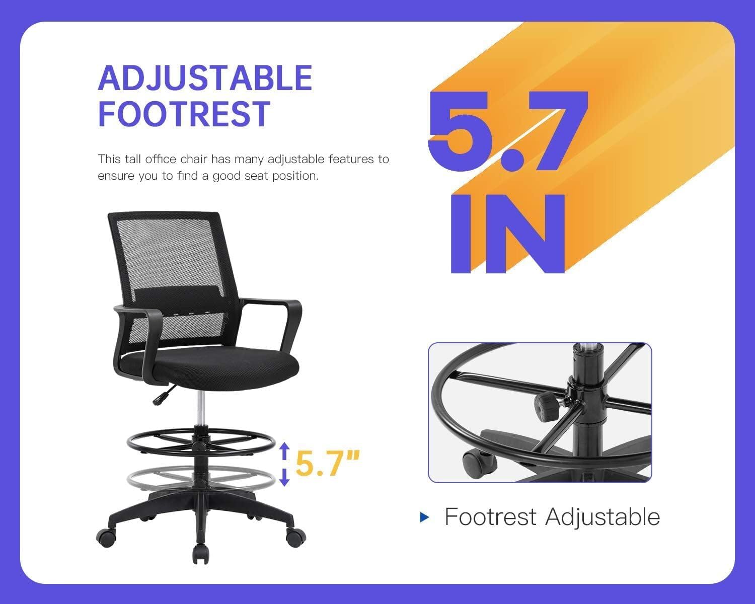 • ADJUSTABLE HEIGHT MATCH YOUR SEATING POSITION - Ergonomic drafting chair covered by breathable mesh and mid back lumbar support protecting your spinal.