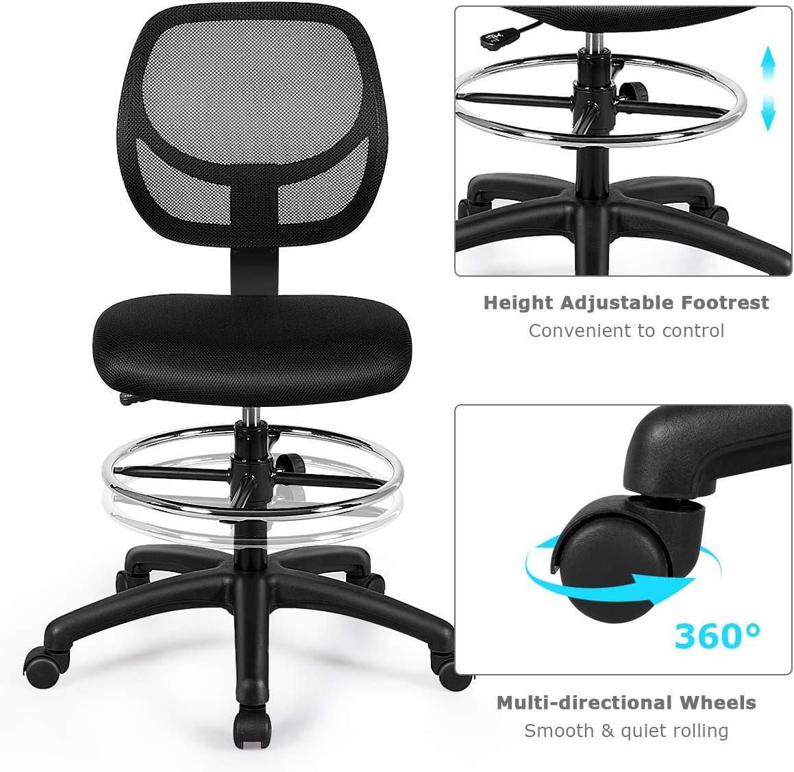 Product DescriptionThis black mesh drafting chair with solid construction boasts a thickly stuffed cushion seat adjustable from 21’’ to 28.5’’, an adjustable footrest with varying height options, and 5 sturdy 360 degree universal casters, to offer as much freedom to you as possible when sitting on this durable chair. To fully adapt to your body curve, this office chair, different from regular ones on the market, has a curved mesh back and seat serving as a reliable and soothing support for sitters of different body sizes. The simple black look of this versatile office chair enables this standing desk chair to successfully blend into offices or study rooms of different styles.FeaturesBreathable and wear-resistant mesh surface avoids accumulation of heatAdjustable seat height, meet different needs for matching up height of table360 degree swivel seat for multi-tasking convenienceAdjustable footrest height offers more comfortErgonomic lumbar support protects your waist wellSoft cushion filled with high-density sponge eliminates your fatigueUniversal wheels add freedom of flexible movementModern and low-key look, a great complement of home, office, sturdy, etc.Stable and durable structure, serve you for many yearsCertified by BIFMA for premium qualitySpecificationsColor: BlackMain material: Mesh, sponge, plasticOverall dimension: 25’’x 25’’x 37.5’’- 45’’(L x W x H)Back size: 16’’x 15’’(W x H)Seat size: 18’’x 17’’(W x D)Seat height: 21’’- 28.5’’Net weight: 20 lbsDynamic weight capacity: 250lbsStatic weight capacity: 330lbsPackage includes:1 x office chair1 x instruction