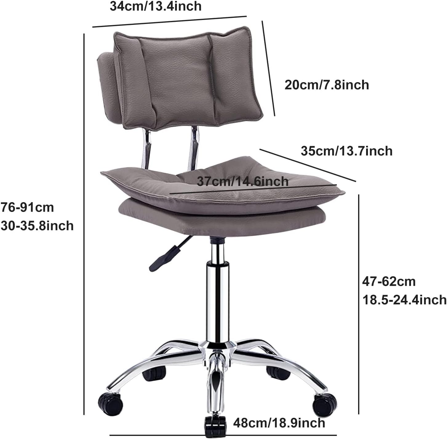 Rolling Stool Chair offers the best versatility and value for your seating needs.Features:※The exclusive Molded foam is specially molded around the seat base,Thicker and softer seat provide extra comfort. thicker leather, elegant stitching even for the bottom side of the seat.※Durable stylish reinforced nylon casters for quiet smooth movement on the floor.※Easy to install, easy use manual are enclosed.Specifications:*Color:Black , Brown , Gray , Green , Off-white*Weight:15.4 lbs.*Weight Capacity:250lbs.*Adjustable Height Range:from 18.5-24.4inch*Base Diameter:18.9inch*Base Type:Chrome metal*Wheel Type:Reinforced nylon*Customer service: Please contact us for any issues.Your satisfaction is guaranteed.