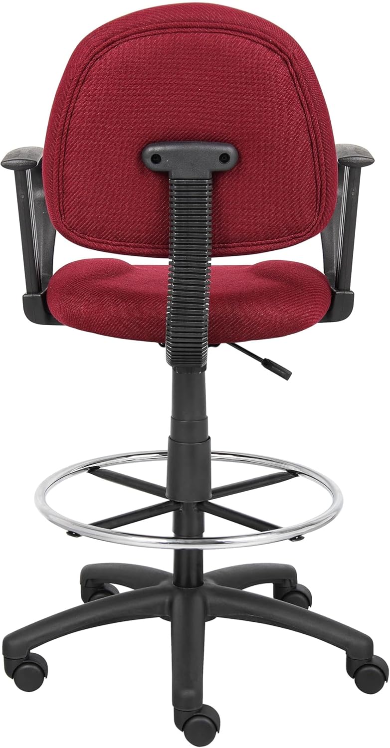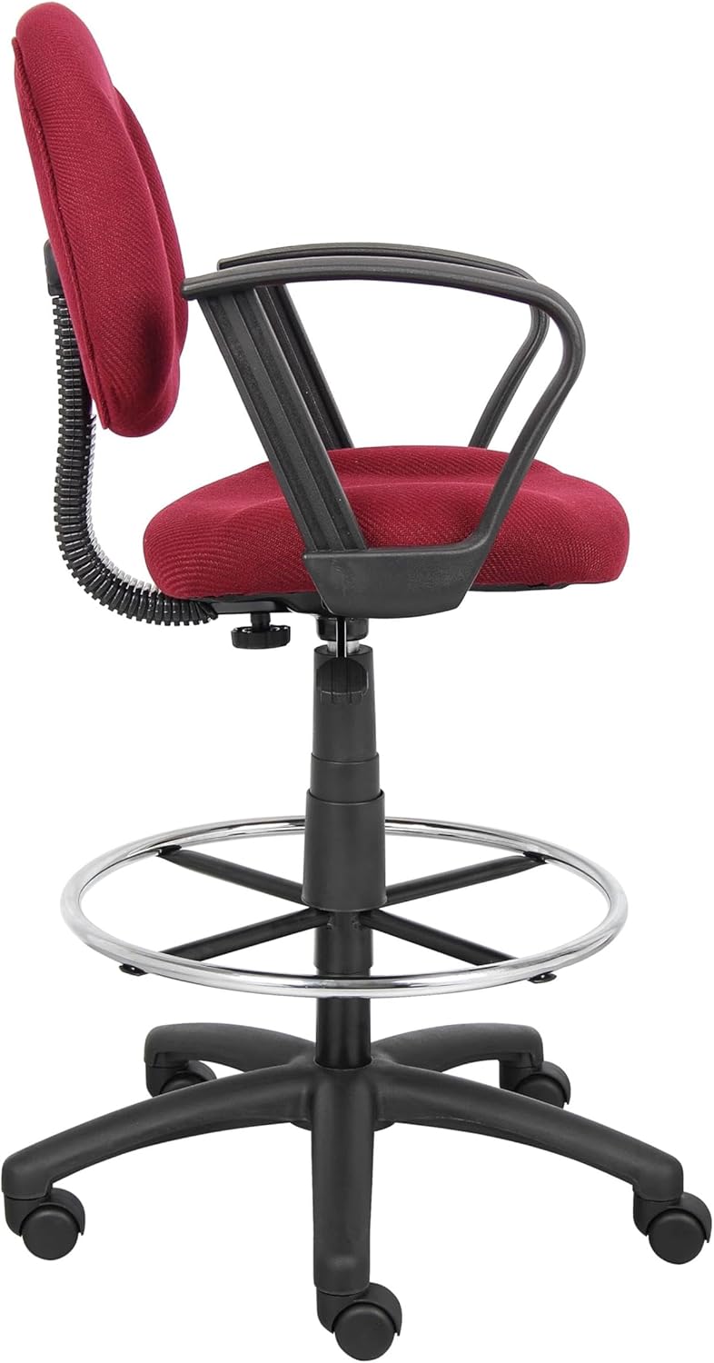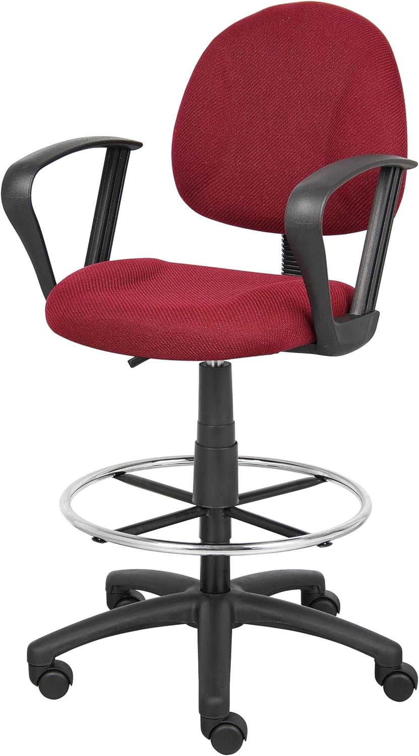 The Stool with footring and loop arms is an ergonomic office chair with a seat size of 17. 5” W by 16. 5” D and 26. 5” to 31. 5” H. Features of the chair include a weight capacity of 250 pounds and easy and smooth height adjustment with its pneumatic gas lift handle. The large 27” nylon base offers increased stability and the hooded double wheel casters makes moving from one part of your office to another easy. The seat is upholstered burgundy tweed, making the chair both functional and aesthetically appealing. Adjustable arms and a removable footrest make this chair comfortable for long periods of work.Features :- Finish: Red- Chair has contoured back and seat help to relieve back-strain- Chair has pneumatic gas lift seat height adjustment- Loop arms- Euro-style nylon base with heavy duty dual wheel casters- Strong 20" diameter chrome foot- Assembly requiredSpecifications :- Product Dimensions : 44.5" -49" H x 25" W x 25" D- Product Weight : 36 lbs- Seat Dimensions : 26.5" - 31.5" x 17.5" W x 16.5" D- Weight Capacity : 250 lbs