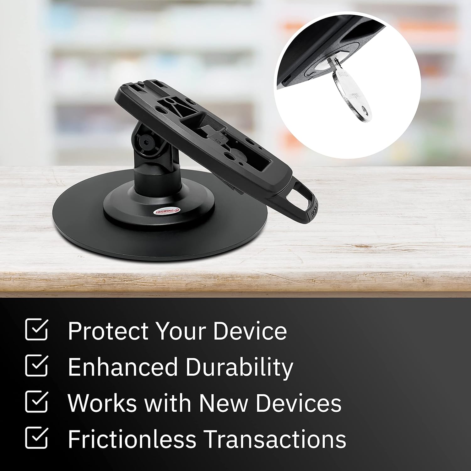 This is an ENS Tailwind key locking 3” pole mount terminal stand and base plate designed for the Ingenico Desk/3500/5000 terminal. This stand is a lightweight composite POS system holder. This stand and plate bundle allows you to securely and invisibly hold the Ingenico Desk/3500/5000 device in place. The lower height terminal stand is the perfect size for high checkout counters. Improve customer payment transactions by lifting the payment terminal off counter, without making it too high for customers. This pole mount terminal stand secures your payment device, protecting it from harm and damage. This freestanding 8'' round plate with silicone rubber feet prevents slippage and allows for merchant flexibility. Secure your terminal without having to go through the hassle of mounting it to your countertop. Protect your device without any damage to the countertop. Enhance your customer experience by lifting your POS terminal and making it more accessible. The pole mount terminal stand tilts 140 degrees, making the movement of your device easier for a better view of the screen. This bundle improves overall payment transactions. Stand and plate bundle allows for extremely easy installation. Simply screw down the stand on this base and move the stand wherever you need it. This bundle includes a base plate for ENS Tailwind device stands, three screws, and silicone rubber feet. The terminal is not included.