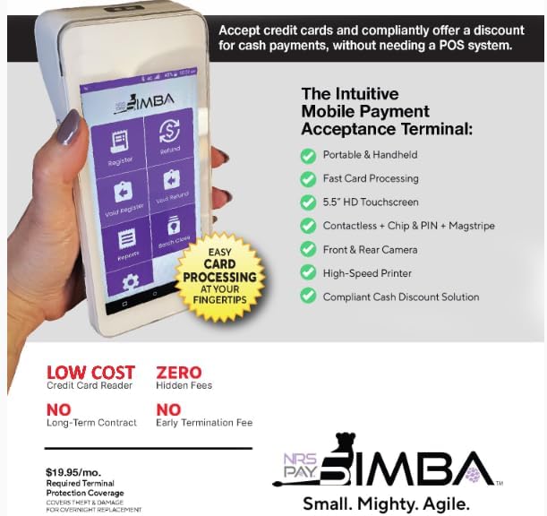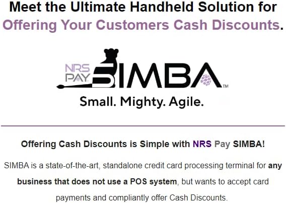 Meet the Ultimate Handheld solution for offering your customers Dual Pricing or Cash Discounts. Simba from NRS is the state of the art, standalone credit card processing terminal. This terminal is perfect for the business that doesn't use a POS or would like to run a standalone system alongside your POS. (If you are sick of your credit card processor but really like your POS, this is a great alternate solution) Compliant dual pricing programs are imperative to protect the safety and security of your business. Simba will make sure you are compliant and stay compliant. A Dual Pricing account with NRS Pay, through SwyftPAY is required for the shipment.