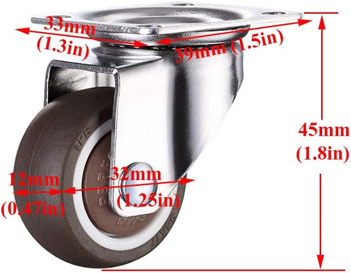 advantage:>? Rotate 360 degrees. Smooth, quiet and sturdy.>? Brake function, safe and stable.>? Non-slip, wear-resistant, protects the floor from scratches.>?Includes: 4 casters, screws 4x16mm>? Brand new: 100%>? Wide range of uses: Rubber wheels can be used in homes, offices, factories, schools, hospitals, warehouses, mobile display cabinets, air conditioners, flower stands, plant stands, etc., including wood floors, carpets, laminates, tiles, etc.>parameter:>? Name: Flat furniture casters>?Number of defects: 4>?Material: rubber, carbon steel bracket>? Wheel diameter: 1 inch / 25mm, 1.25 inches / 32mm, 1.5 inches / 38 mm, 2 inches / 50 mm>Load capacity: 1 inch / 15kg, 1.25 inches / 20kg, 1.5 inches / 30kg, 2 inches / 40kg (1)>?Our products have been thoroughly tested, inspected and packaged prior to delivery. You can buy with confidence. happy shopping!>? Due to manual measurement, the dimensional error is 1-2 mm. The colors may vary slightly due to differences in displa