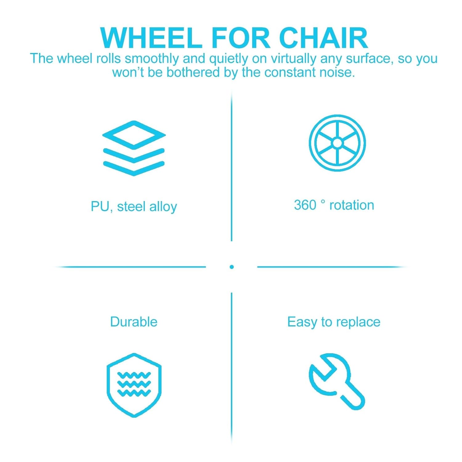 Package Include 5 x Caster Wheels Characteristics -Product Info:Office chair casters - Size: 8.50X7.00X5.50cm/3.34X2.75X2.16 inch. - Material: PU, steel alloy. - Great as replacement castors for chairs, tables, racks, file cabinets, machinery and more Chair Universal Wheel. - This wheel has a 360-degree -directional rotation design, which is more convenient for your use office furniture casters. - This universal wheel is suitable for hardwood, tile or carpet floor. The product has practical functions office chair replacement wheels. - material, the product is strong and , wear-resistant, and has good mute effect. - Ingenious design and high class PU materials make it have a large load-bearing capacity.Goods Informationreplacement caster wheels Are you looking for a , yet universal wheel? Are you in search of a sturdy, trustworthy universal wheel that can do multiple jobs and serve you for a long term? , ! Our premium universal wheel must meet your needs