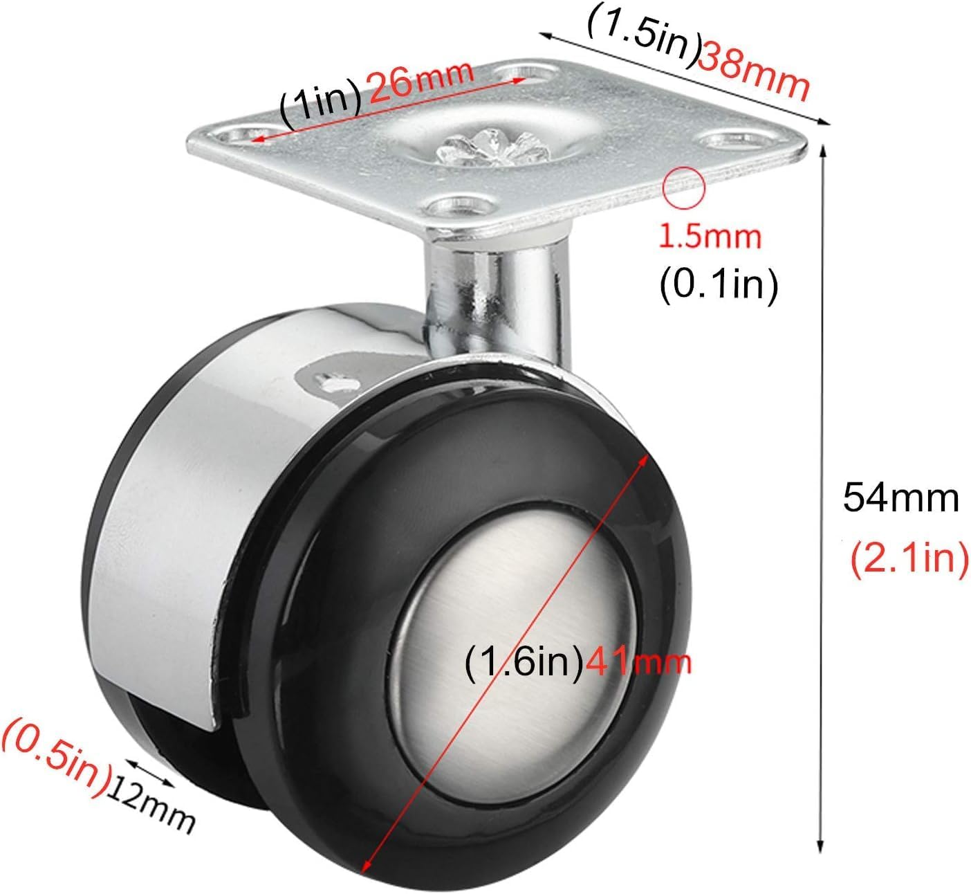 ◆360-degree rotating double-wheel casters can be used as direct replacement wheels for office chairs.◆Mute, smooth, no damage to the floor, strong applicability. You will feel safe when you roll in any corner of your office or family room.◆Scope of application: office chairs, trolleys, tables, small equipment, small tables, plant shelves, bookshelves, shoe boxes, toy boxes, shopping carts, workbenches.【Product Specifications】Material: plastic, metalInstallation type: flat installation◆Wheel diameter: 41 mm / 1.6 inchesWheel width: 12 mm/0.5 inchMounting plate: 38 mm / 1.5 inchesMounting plate hole distance: 26 mm/1 inchMounting plate thickness: 1.5 mm/0.1 inchHeight: 54 mm / 2.1 inches◆Wheel diameter: 50 mm / 2 inchesWheel width: 12 mm/0.5 inchMounting plate: 48 mm/1.9 inchesMounting plate hole distance: 33 mm / 1.3 inchesMounting plate thickness: 1.5 mm/0.1 inchHeight: 69 mm/2.7 inchesRated load: 125 kg (25 kg per wheel)Package includes: 5 office chair casters【note】◆All products are manually measured. Due to the influence of shooting angle, light and viewing angle, slight errors and chromatic aberration will inevitably occur. (Please check the size of the threaded rod before buying)◆We are always committed to providing quality services.