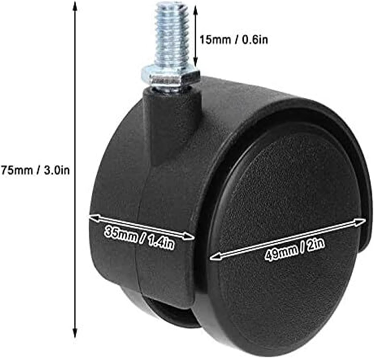 Designed to enhance mobility, durability, and comfort. These heavy-duty castor wheels are crafted from premium steel and rubber materials, providing a smooth and quiet rolling experience that protects your floors from scratches. Whether you have hardwood, carpet, tile, or laminate floors, these castor wheels are safe and efficient.These wheels offer easy installation with a universal fit, making them suitable for most office chairs. Their robust design s they can withstand the rigors of daily use, providing long-lasting performance.Name: Caster WheelsMaterial: PlasticWeight: Approx. 188g/6.6ozHeight: Approx. 75mm/3.0inDiameter: Approx. 49mm/2inPackage List:4 x Casternumber of boxes: 1Versatile and convenient, the Castor Wheels are ideal for home offices, conference rooms, study areas, and gaming setups. ensuring you have everything you need for an easy upgrade. Enhance your chair's mobility and enjoy a smoother, quieter rolling experience with Castor Wheels.
