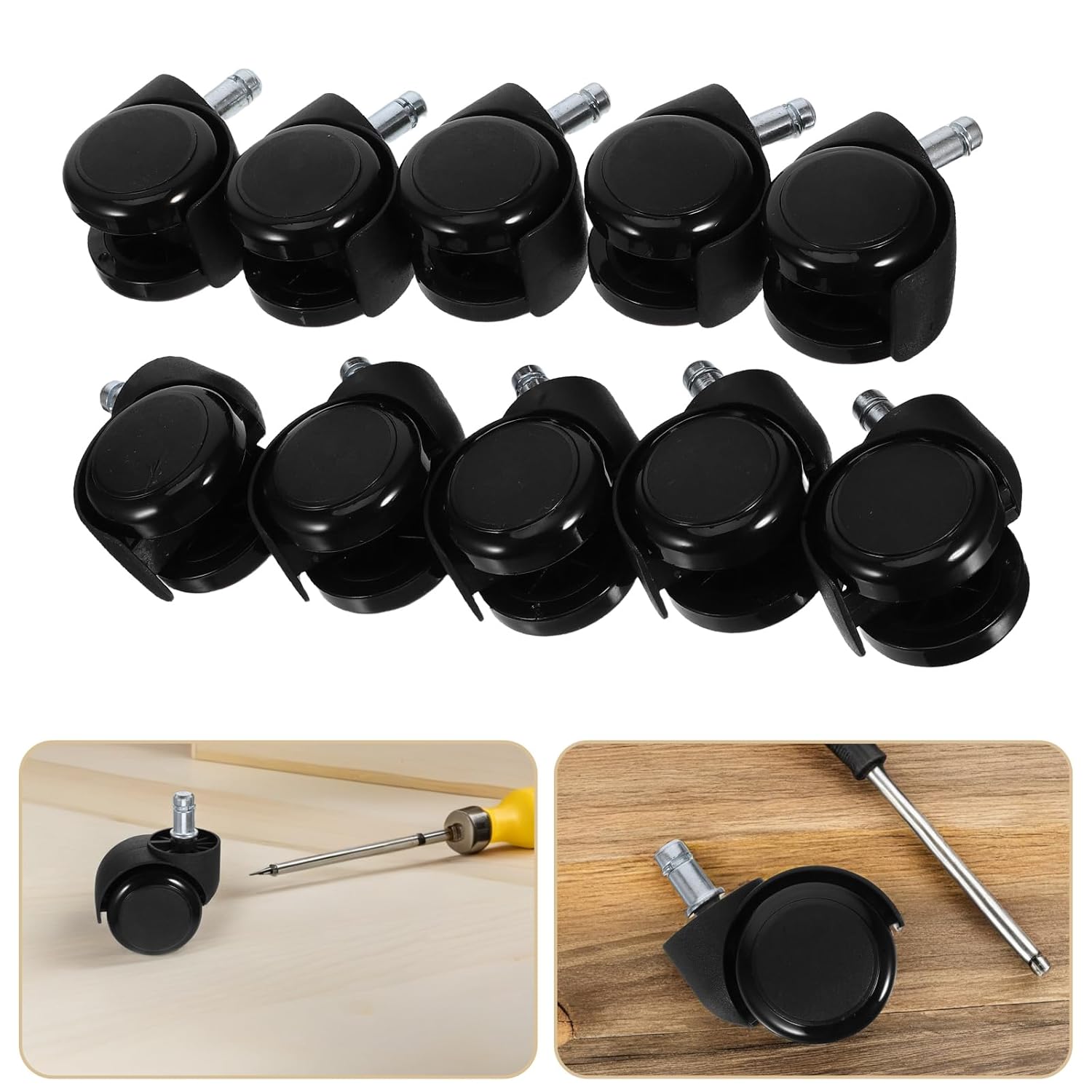 Package List 10 x office chair casters Characteristics -Color:Black -strong construction: engineered for heavyduty applications, these wheels offer reliable support and stability for large office chairs 2-inch chair casters -Size:7.70X6.70X5.20cm/3.03X2.63X2.04in -Material:Nylon + Steel - floors: protect your flooring with these furnituregrade caster wheels, designed to prevent marks and chair leg wheels casters -Versatile design: the black color and universal size make these wheels compatible with most office chairs and furniture -Product Info: Office chair casters -Quiet rolling: silent swivel technology ensures smooth and noisefree movement, enhancing focus in quiet office settings chair wheels for tile floors -Simple installation: the innovative stem clip design makes replacing or installing these caster wheels quick and straightforward office caster wheelsGoods Informationfurniture wheels replacement Whether for work or relaxation, they provide a stable and quiet rolling experience.universal caster wheels The smooth-rolling design of these chair wheels enhances mobility, allowing users to move freely without resistance.silent caster wheels Their universal compatibility makes them suitable for replacing worn-out wheels on various furniture pieces