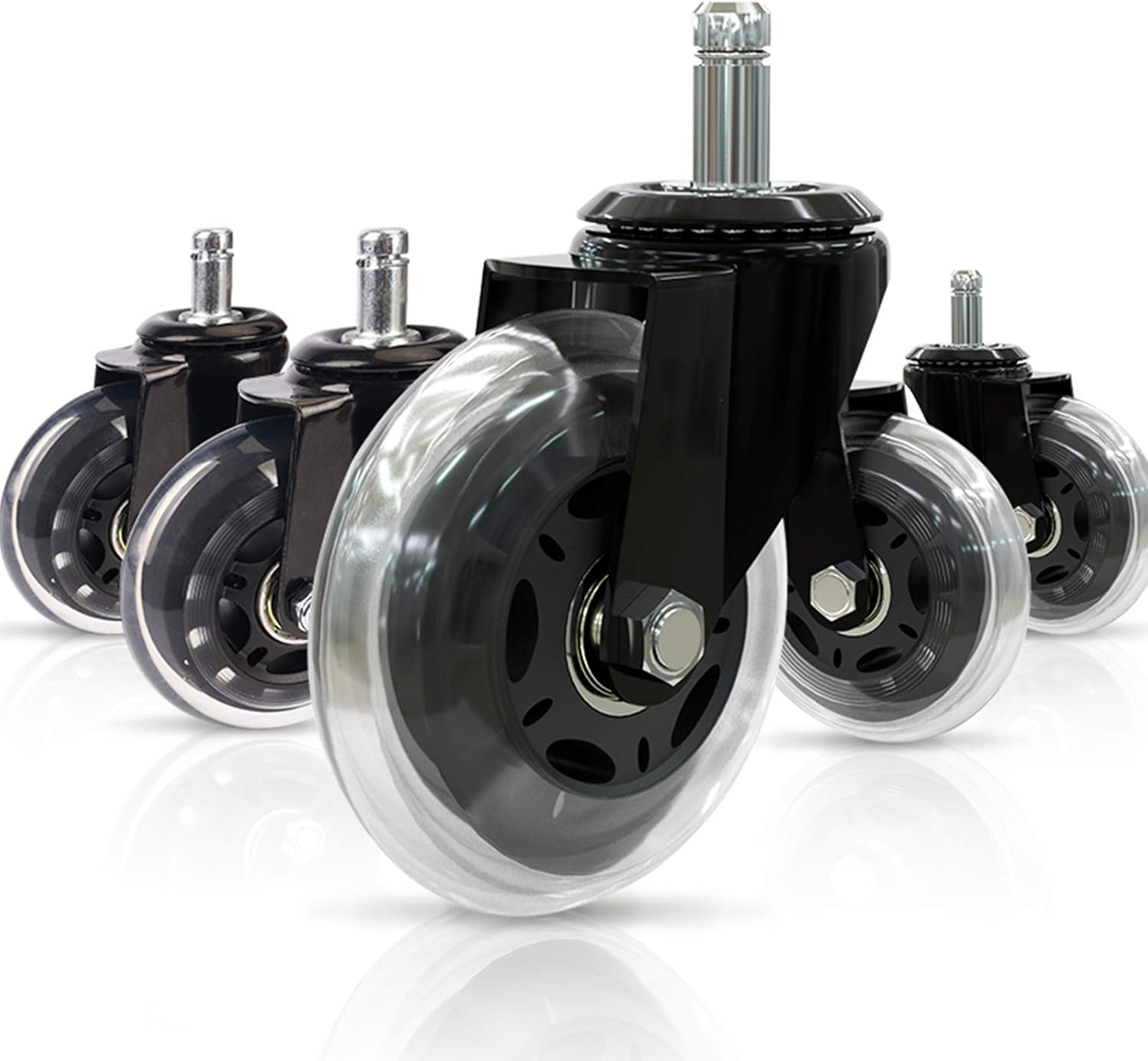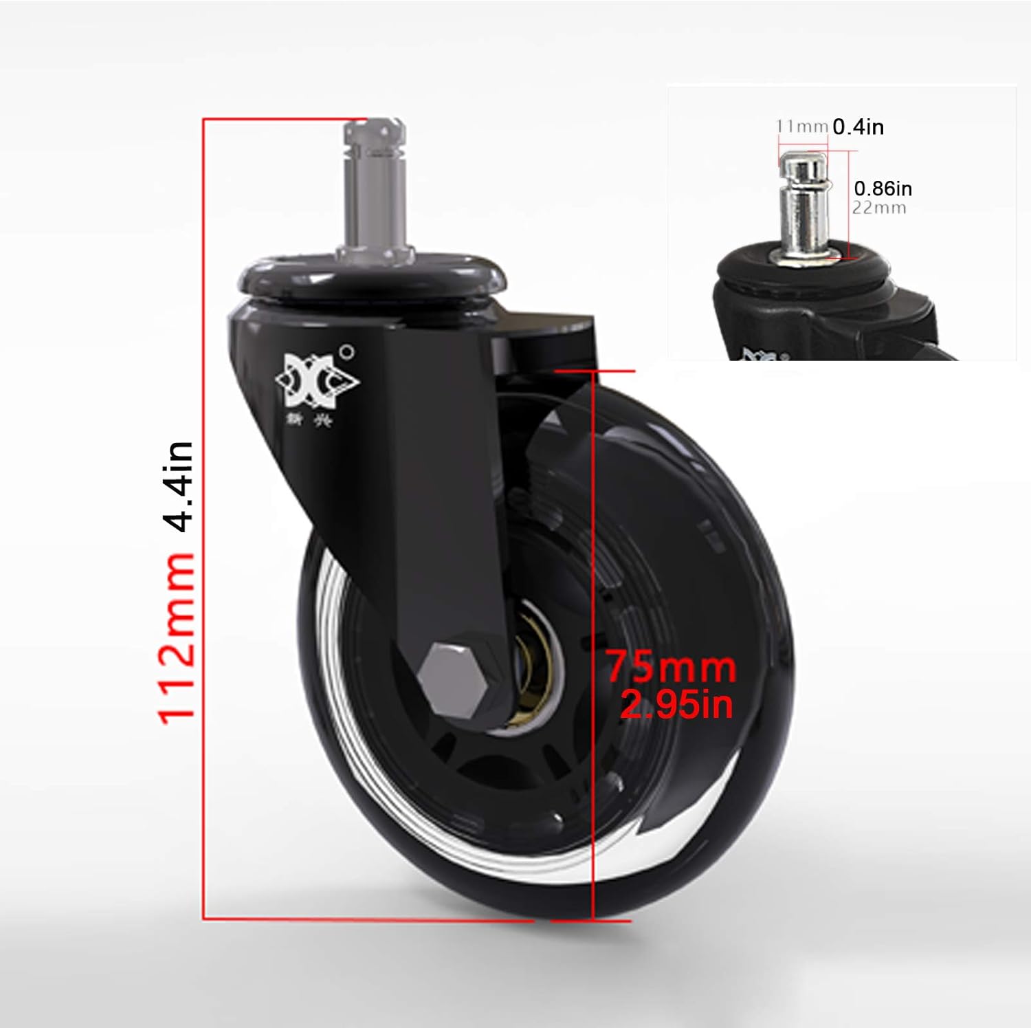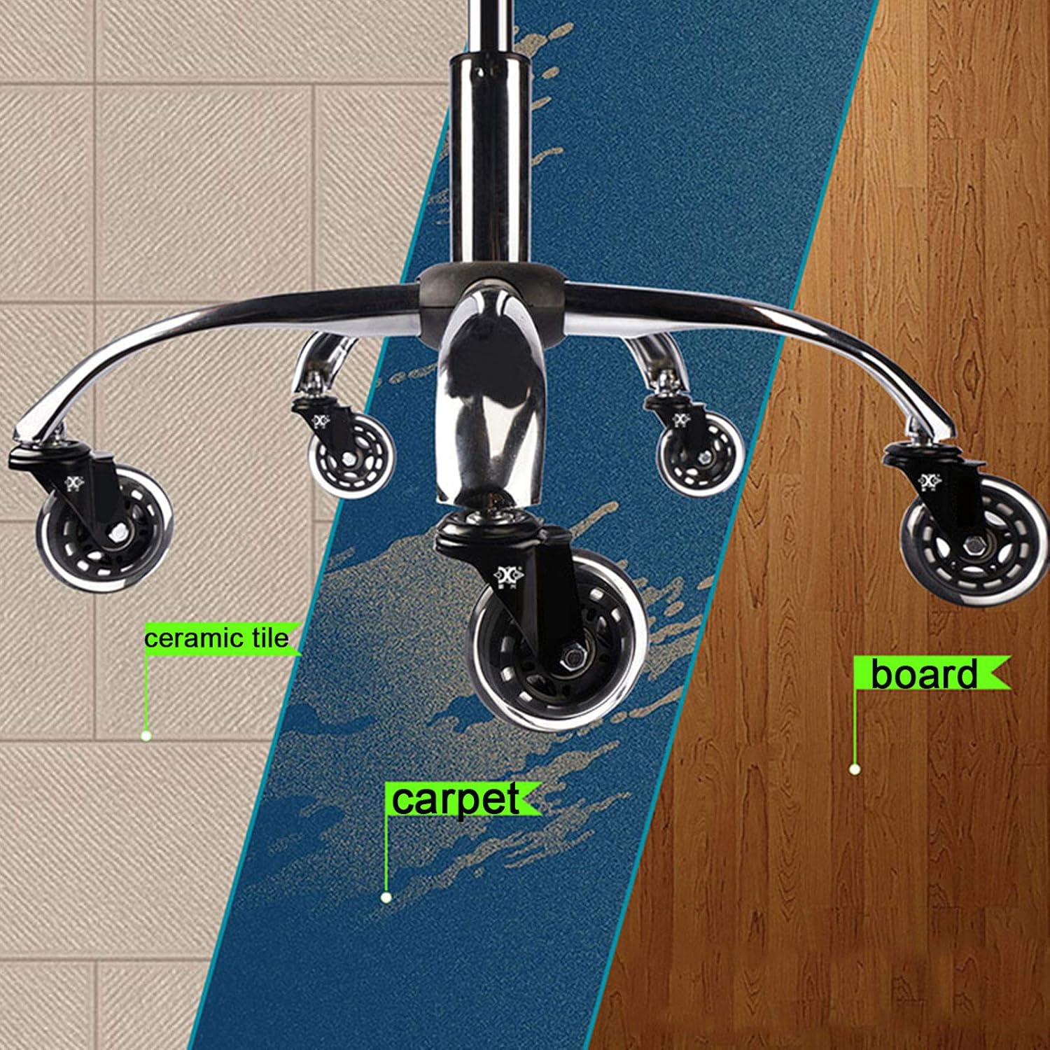 *The structure of the casters is unique. Each wheel is made of transparent, soft PU material and steel. This provides the perfect combination of softness, durability and grip. *It is important to protect your expensive floors from damage. Our casters can be safely used on hardwood, ceramic tile, carpet, laminate, bamboo, cypress, etc. *360° flexible rotation, can slide freely, smoothly and silently around the office, high load-bearing capacity (200kg/440 lbs), no tangles and years of durability. *Our wheels do not need chair cushions at all, which greatly increases the mobility of the office chair. *Our casters conform to most office chairs on the market, and they can be fixed to the base of the office chair without installing any tools. Product specifications: -Product name: office chair casters -Material: PU+steel -Wheel diameter: 75mm/3inch -Mounting rod specifications: 11*22mm(0.4*0.86inch) -Total load: 200kg/440 lbs -Package content: 5*casters *If our wheels are not suitable for your chair, just contact the GUAWJRZDP team and we will serve you.