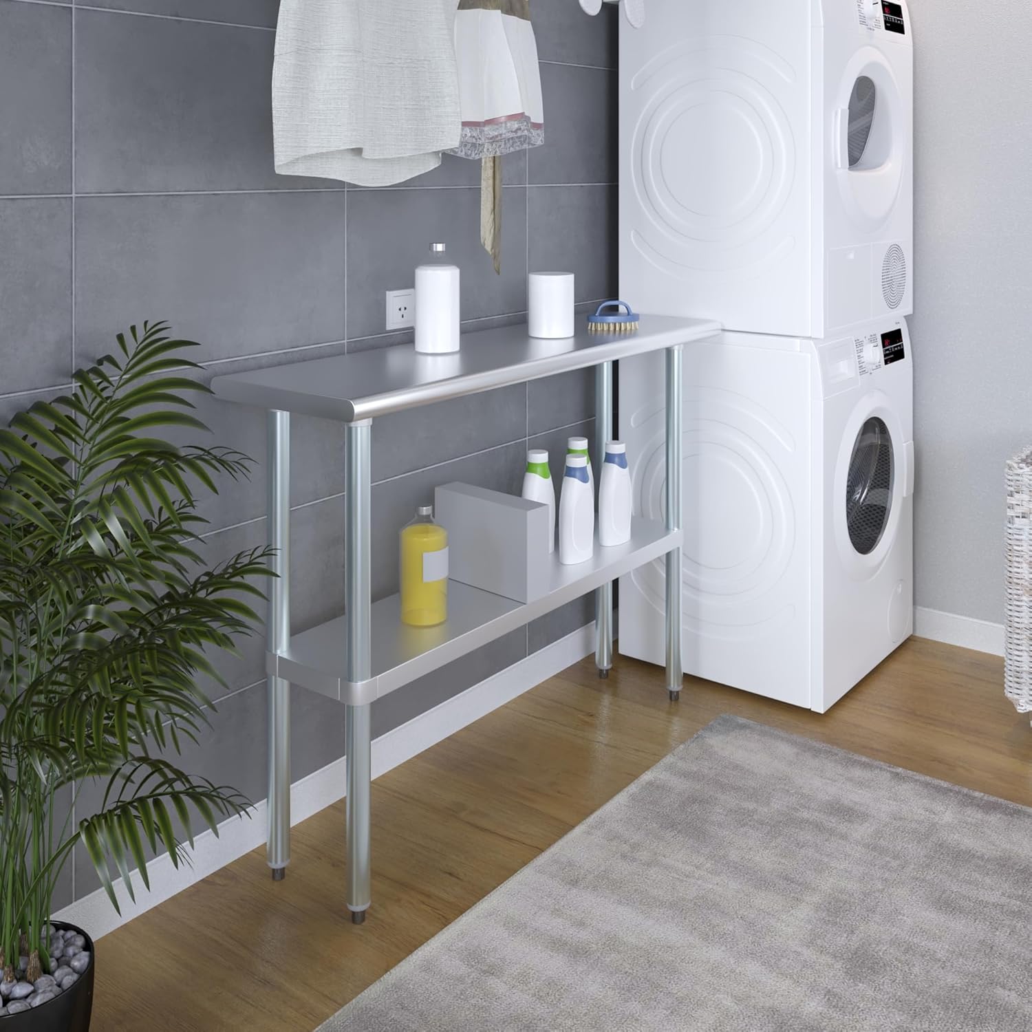AmGood 14 in. deep x 48 in. long x 35 in. high stainless steel table This Stainless Work Table has a weight capacity of 370 Lbs , evenly distributed. The bottom shelf has a capacity of 230 Lbs, evenly distributed.AmGood Stainless Steel Utility Work Table is a great addition to any home or business. It serves perfectly for a variety of tasks, such as functioning as a workbench, prep table, or general-purpose utility table. Moreover, the included bottom shelf offers additional storage space. Some assembly is required.The table is made with 18 gauge corrosion resistant 430 stainless steel top and galvanized legs and bottom shelf. It's built to withstand heavy use and everyday wear and tear. Whether you need a sturdy workspace for your next DIY project or simply want an extra prep area in the kitchen, this utility table has you covered.NSF certified to meet the strictest standards for public health protection. The industrial-quality manufacturing process meets the highest regulatory requirements for construction, safety, and durability.Common Applications:⦁ Food Prep Table For Commercial Kitchen⦁ Kitchen Island⦁ Counter Extension⦁ Utility Bench for Shop⦁ Professional Work Station⦁ Garage Work Bench⦁ Laundry Clothes Folding Table⦁ Brewing Setup ⦁ Exam Table For Veterinarians ⦁ Butcher ShopProduct Specifications:Stainless steel work table surface has curved edges for safety and comfort. It incorporates a heavy duty adjustable galvanized bottom shelf and leveling feet.⦁ 18 Gauge 430 Stainless Steel Top⦁ Galvanized Adjustable bottom shelf⦁ Adjustable feet to compensate for uneven floor⦁ Adjustable under shelf-great for storage⦁ Height: 35 in.⦁ NSF Certified⦁ Sturdy & easy to setup⦁ Heavy DutyAssemble and install with no effort. No additional tool or kit needed. Assembly instructions and everything you need is included. Ships knocked down.