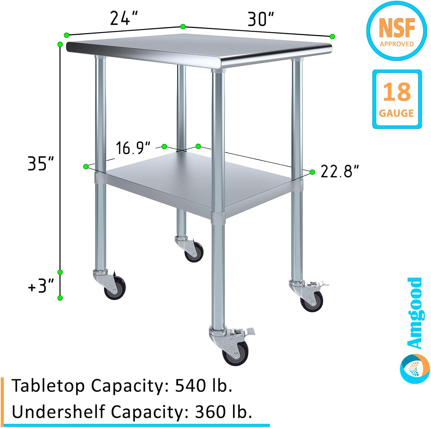 A Stainless Steel Utility Work Table with Wheels is a great addition to any home or business. It is perfect for a variety of tasks, including a workbench, prep table, or general-purpose table. The included bottom shelf provides additional storage space. Some assembly is required.NSF certification allows the table to be used in any food service environment.The table is made with corrosion resistant 430 stainless steel top and galvanized legs and bottom shelf. It's built to withstand heavy use and everyday wear and tear. Whether you need a sturdy workspace for your next DIY project or simply want an extra prep area in the kitchen, this utility table has you covered.Common Applications:Food Prep Table For Commercial KitchenKitchen IslandCounter ExtensionUtility Bench for ShopProfessional Work StationGarage Work BenchLaundry Clothes Folding TableBrewing SetupExam Table For VeterinariansButcher ShopProduct SpecificationsMobile stainless steel work table surface has curved edges for safety and comfort. It incorporates a heavy duty adjustable galvanized bottom shelf and leveling feet.18 Gauge 430 Stainless Steel TopGalvanized Adjustable bottom shelfAdjustable feet to compensate for uneven floorAdjustable under shelf - great for storageIncludes a set of 4 casters for easy mobility. Two of which are lockingHeight: 35" + 3" CastersNSF CertifiedSturdy & easy to setupHeavy Duty