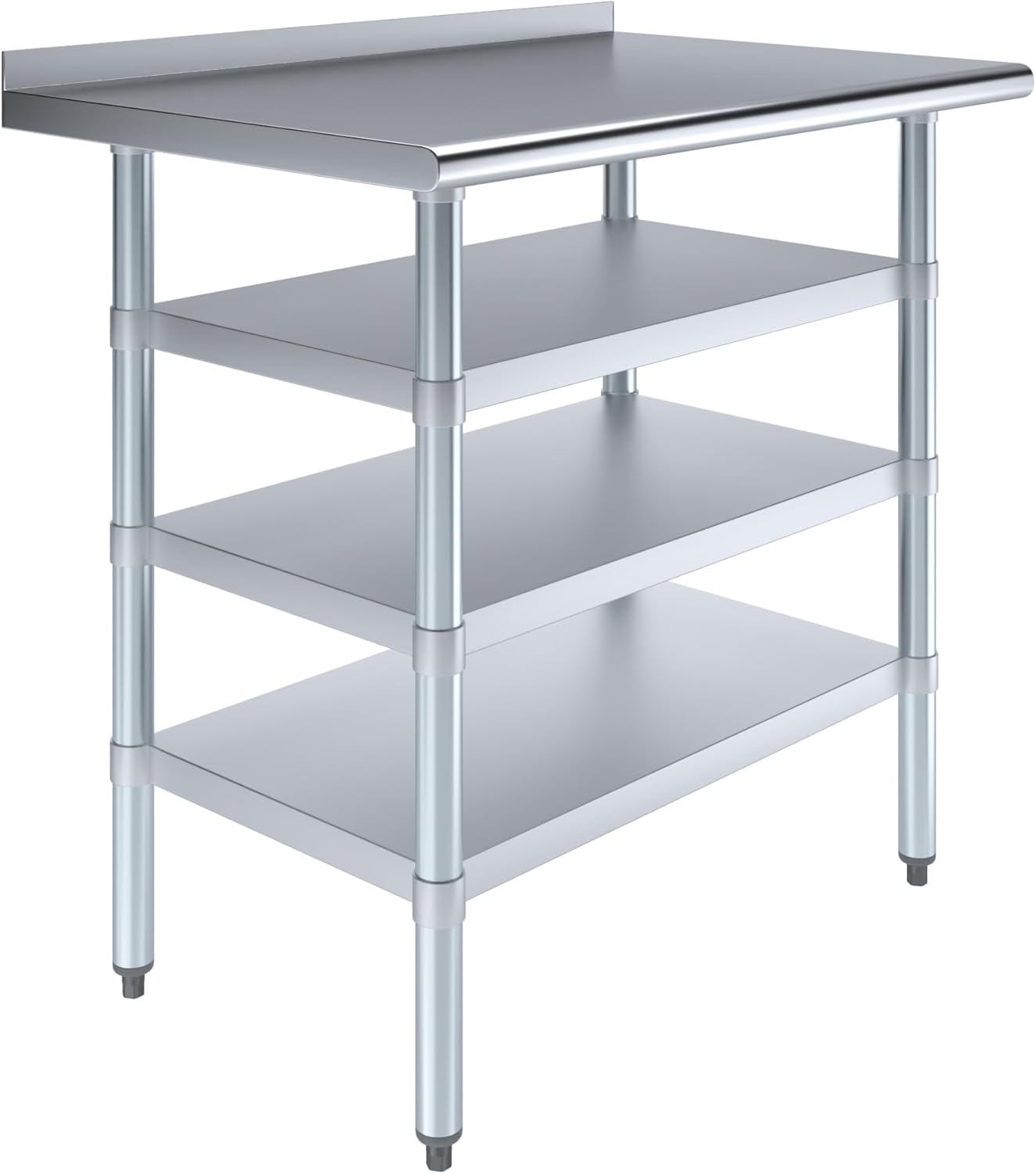 Stainless Steel Work Table With 3 Galvanized Under ShelvesCommon Applications:Food Prep Table For Commercial KitchenKitchen IslandCounter ExtensionUtility Bench for ShopProfessional Work StationGarage Work BenchLaundry Clothes Folding TableBrewing SetupExam Table For VeterinariansButcher ShopProduct SpecificationsStainless steel worktable surface has curved edges for safety and comfort. It incorporates a heavy duty adjustable galvanized Under Shelves and leveling feet. 18 Gauge 430 Stainless Steel Top3 Galvanized Adjustable Under ShelvesAdjustable feet to compensate for uneven floorHeight: 35"NSF CertifiedSturdy & easy to setupHeavy Duty