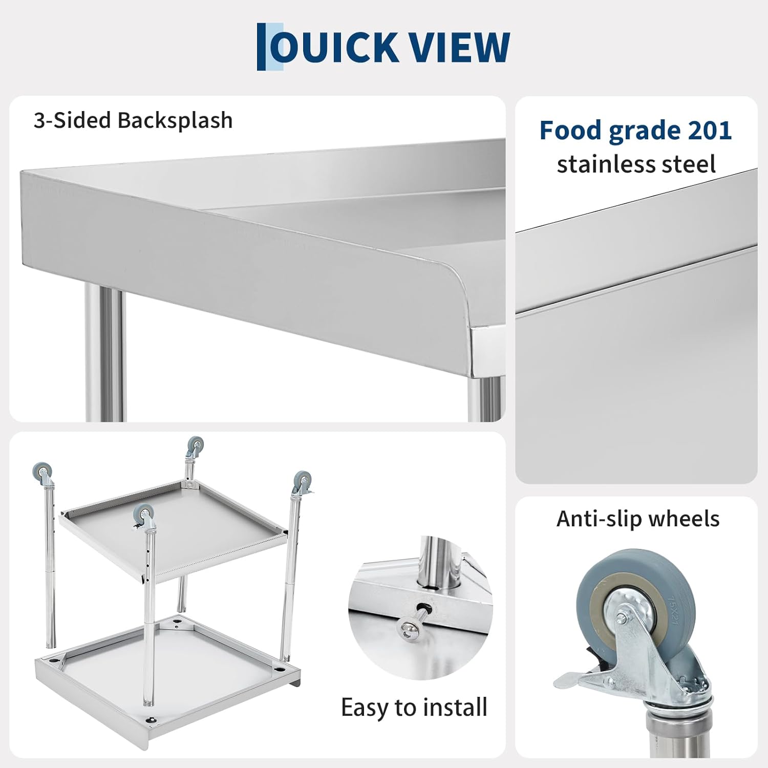Ready to upgrade your workspace? Imagine rolling this stainless steel prep table wherever you need it, giving you sturdy, organized, and easy-to-clean space for any cooking, grilling, or entertaining occasion.Highlights at a Glance:- Heavy duty stainless steel holds up to daily kitchen demands - Adjustable lower shelf creates extra storage for cookware or supplies - Four swivel casters with brakes for easy movement and secure placement - 3-sided backsplash helps keep mess and spills off walls and floors - Simple to assemble with clear instructions and labeled parts - Versatile for use in commercial kitchens, home, or outdoors - Smooth surface is easy to clean after prep, cooking, or servingSpecification:Product Name: Stainless Steel TableProduct Dimension: 24x24x30 / 30x30x30 / 36x30x30 in Load Capacity: 440 LBColor: SilverMaterial: Stainless Steel Friendly Note:Please review all instructions and ensure all parts are included before starting assembly.For best results, loosely attach all screws and bolts at first, then fully tighten them once the table is properly aligned.Clean the stainless steel surfaces regularly with a soft cloth and mild soap to maintain shine and prevent stains.Always dry the prep table thoroughly after cleaning, especially if used outdoors.Packing List:1x Stainless Steel Table1x Hardware Pack1x Assembly Instruction