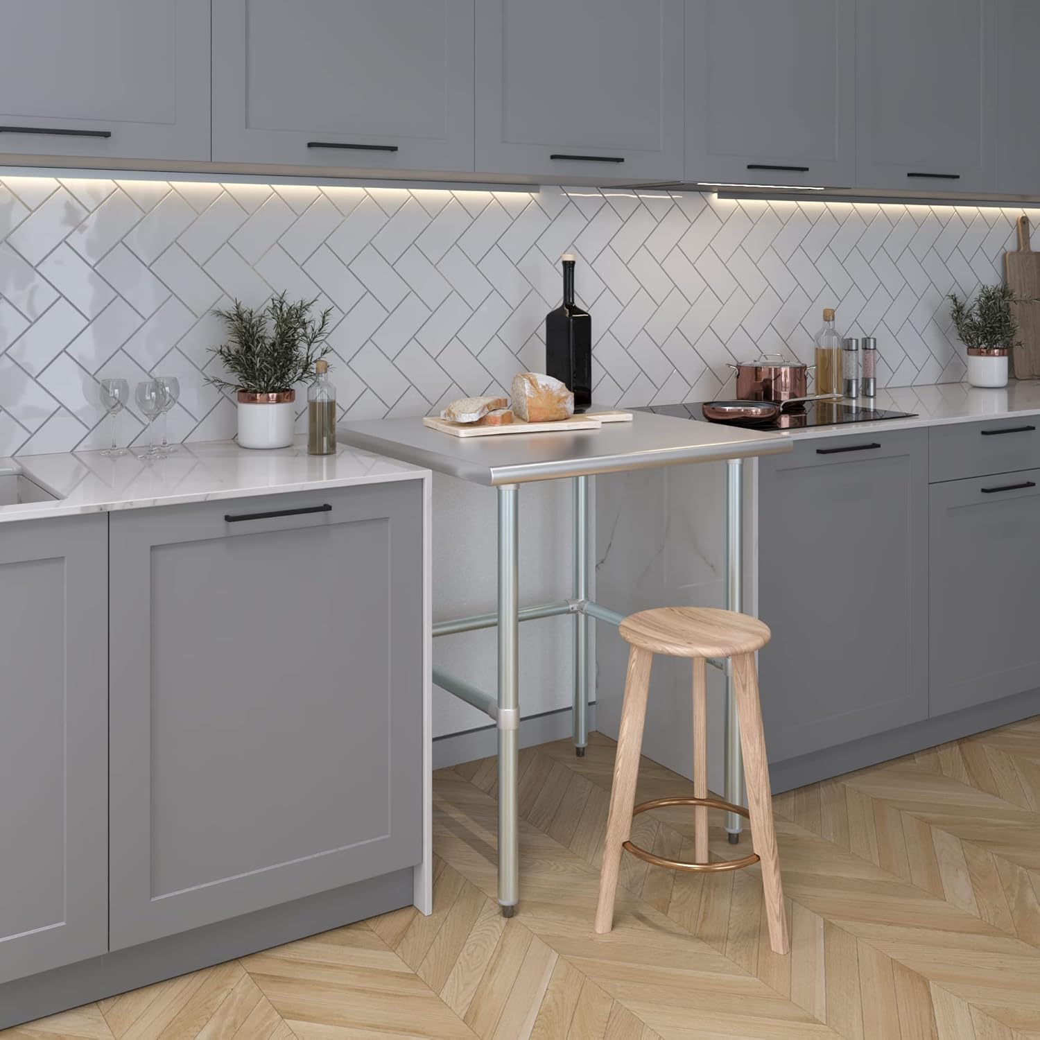 • This heavy-duty industrial quality multi-purpose stainless steel utility table is a great fit for a variety of commercial and residential applications such as commercial kitchens, garages, labs, laundry room, etc The tabletop is made with 18 gauge 430 stainless steel. The legs are made with galvanized steel. Adjustable bullet feet allow to improve stability on uneven floors and prevent the floor from being scratched.