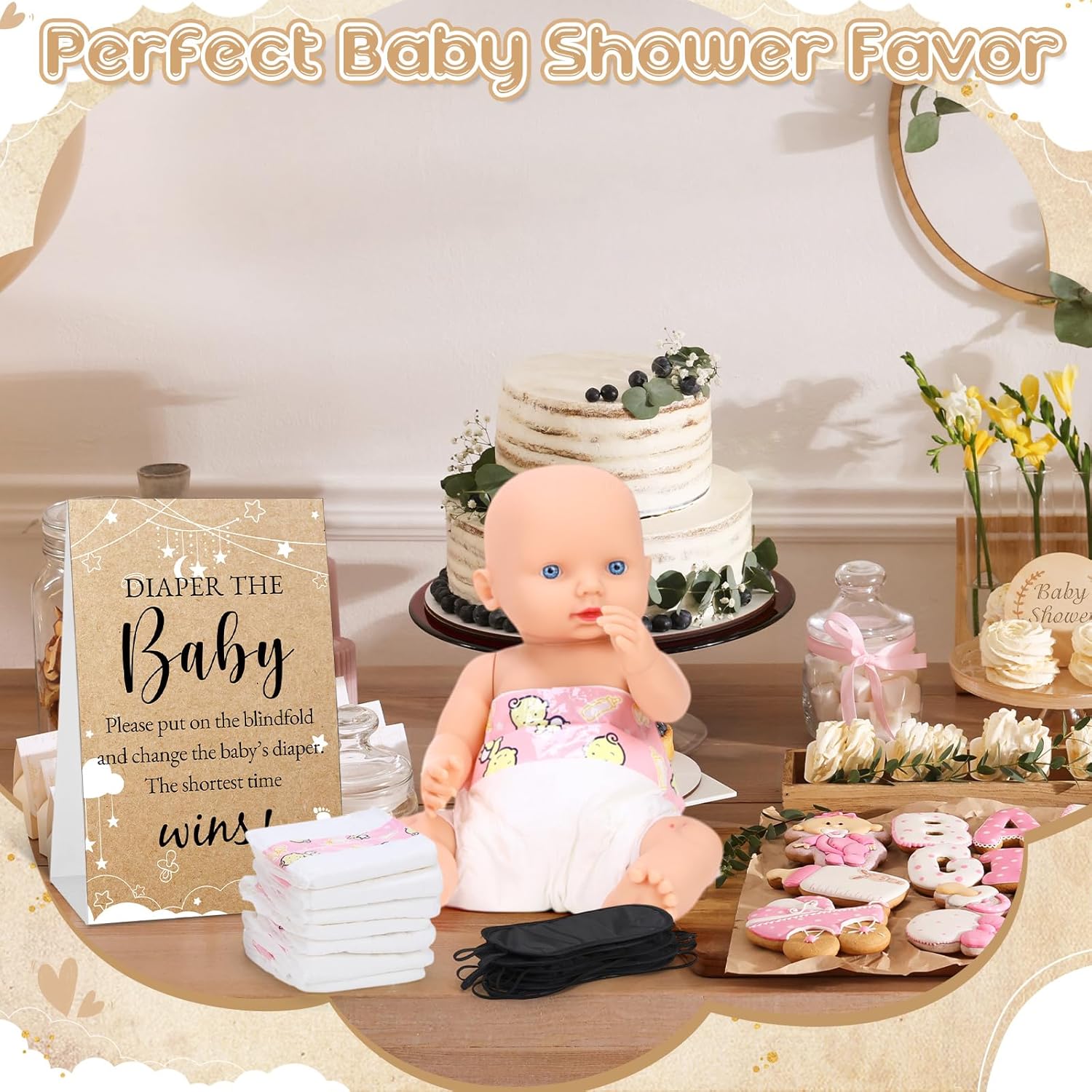 Features: Enhance Your Party Theme: Liven up your party theme with the diaper baby shower game Create As You Like: You can also add more blindfolds, or increase the number of turns and limit the game time to create a new way of playing Specifications: Material: cardboard Color: multicolored Size: Doll stands tall at about 11.81 inches Diaper's size about 4.72 x 4.13 inches/ 12 x 10.5 cm Blindfold around 7.2 x 3.3 inches/ 18.5 x 8.5 cm Sign approx 7.09 x 5.12 inches/ 18 x 13 cm Package includes: 6 x Baby dolls 24 x Diapers 6 x Polyester blindfolds 1 x Cardboard game sign Notes: Manual measurement, please allow slight errors on size. The color may exist a slight difference due to different screen displays