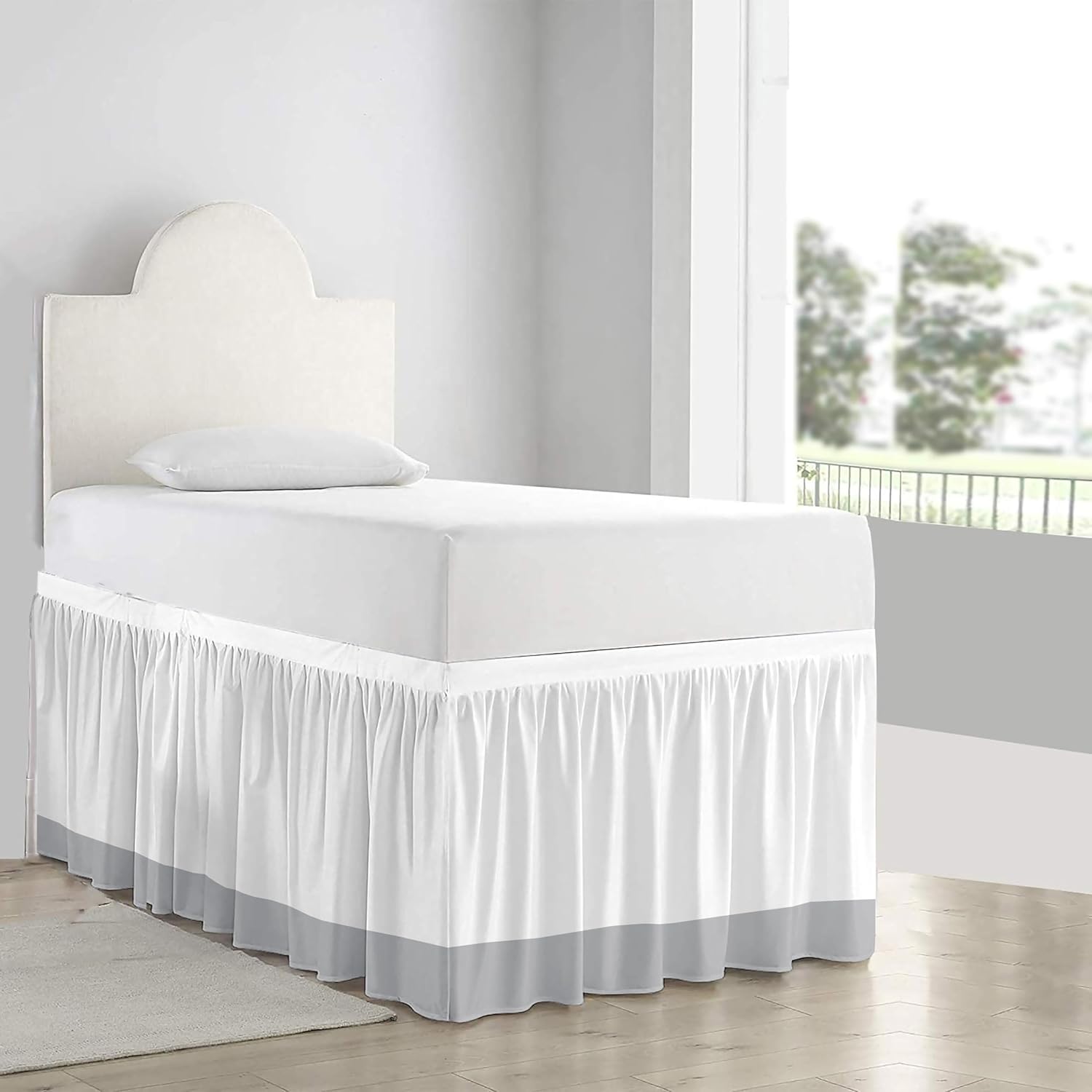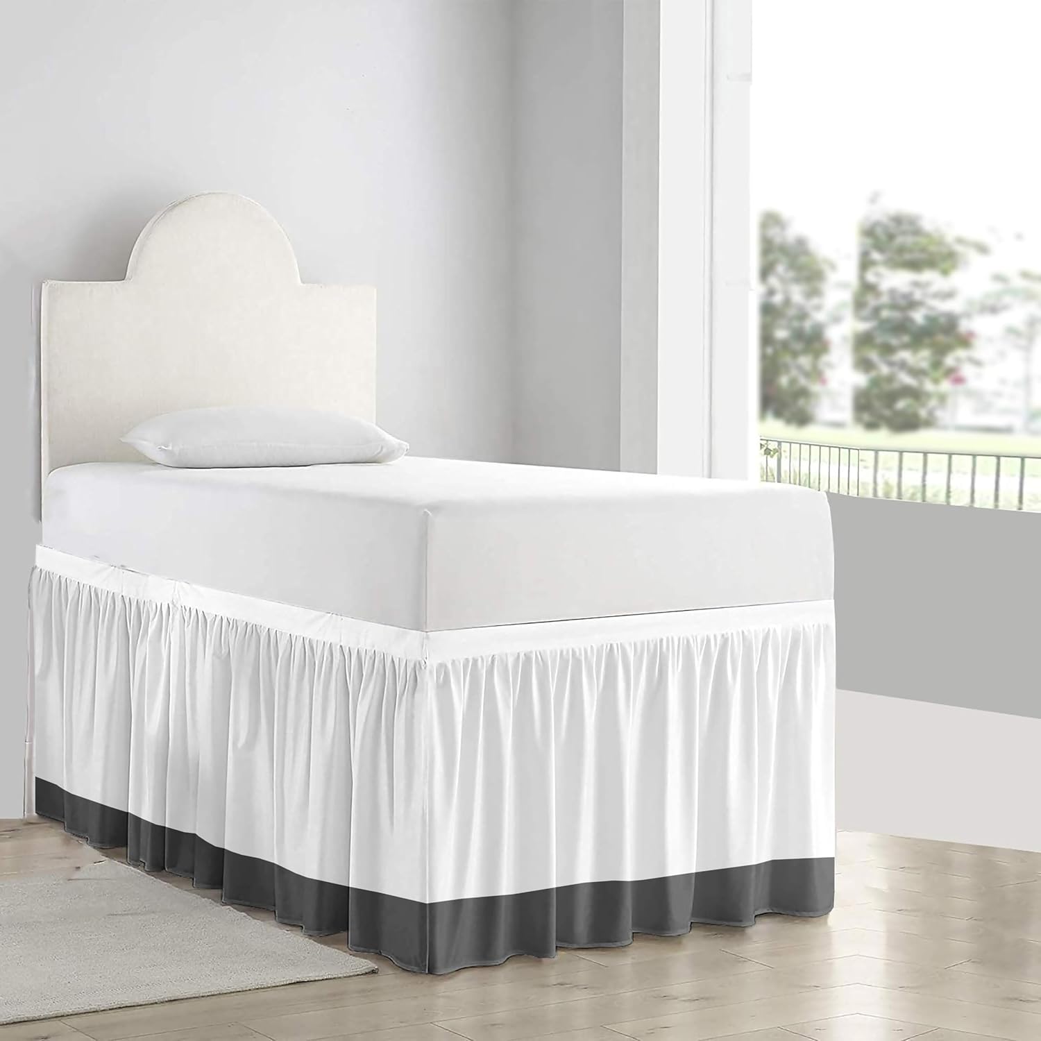 Dorm Room Extra Long Bed Skirt A perfect way to add style to your college dorm room is with your unique extra long Twin bedding, Made from a soft and durable cotton/poly blend fabric (60% Cotton/40% Polyester blend) and smartly designed with one Velcro/elastic side and three fabric sides, Delightful ruffled design features gathered ruffles around 3 sides of bed for a classic, beautiful look. This ruffle gathered dorm bed skirt is having the pretty appearance. It will hang nicely & helps to hide the space below bed. Stylish & Perfect Look The dorm room bed skirt has a generous length, reaches the floor easily and hides any under the bed storage, hides misshapen box springs, bed frames and bedposts, deflects dust and particles that might otherwise collect underneath your bed or simply to give your bed a uniform and sleek look.