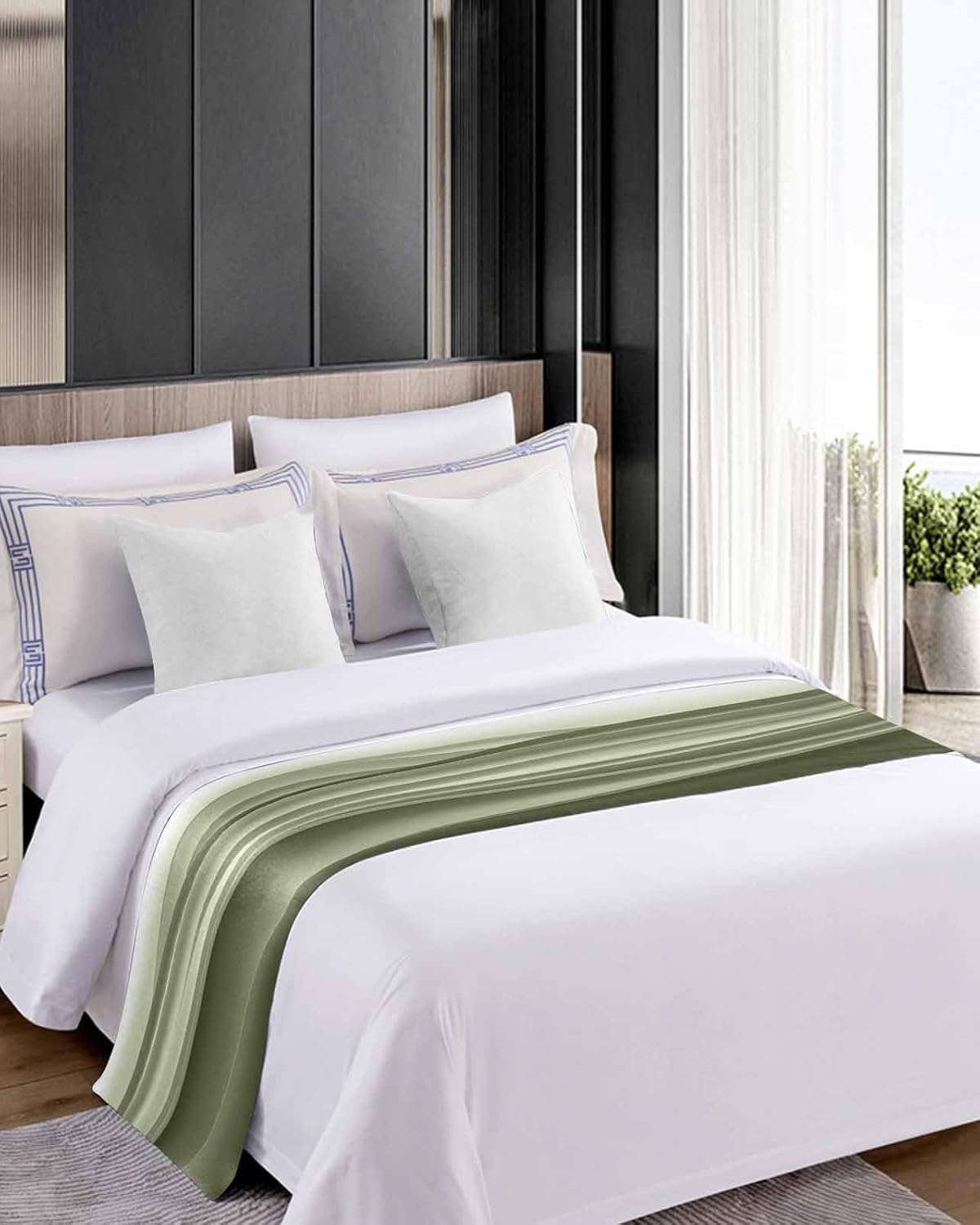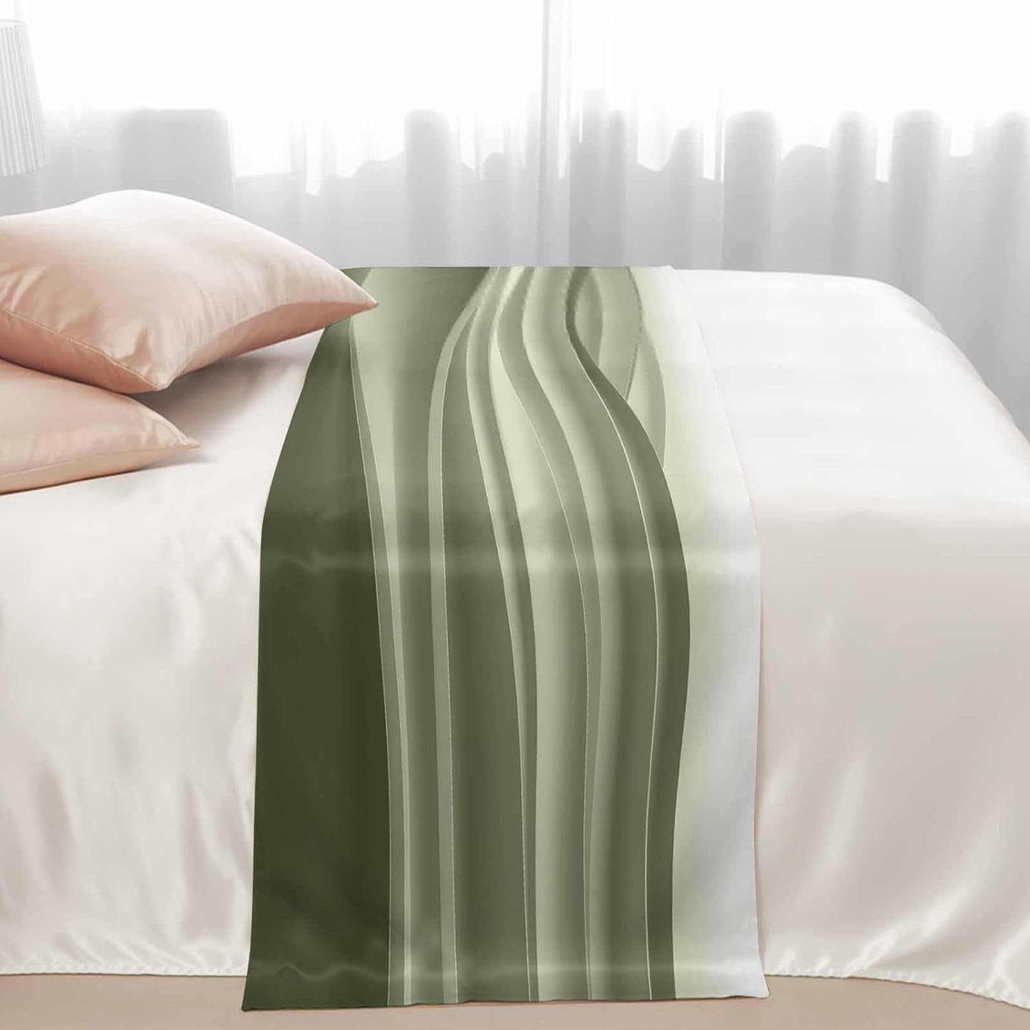 Coastal Sage Green Bed Runner Scarf Bedding Accessory For Twin Size Bed,Soft Bed Scarves And Runners Stainproof Bedroom Decor For Hotel Wedding Room,Seawave Stripe Minimalist Ombre Art 71"x20"